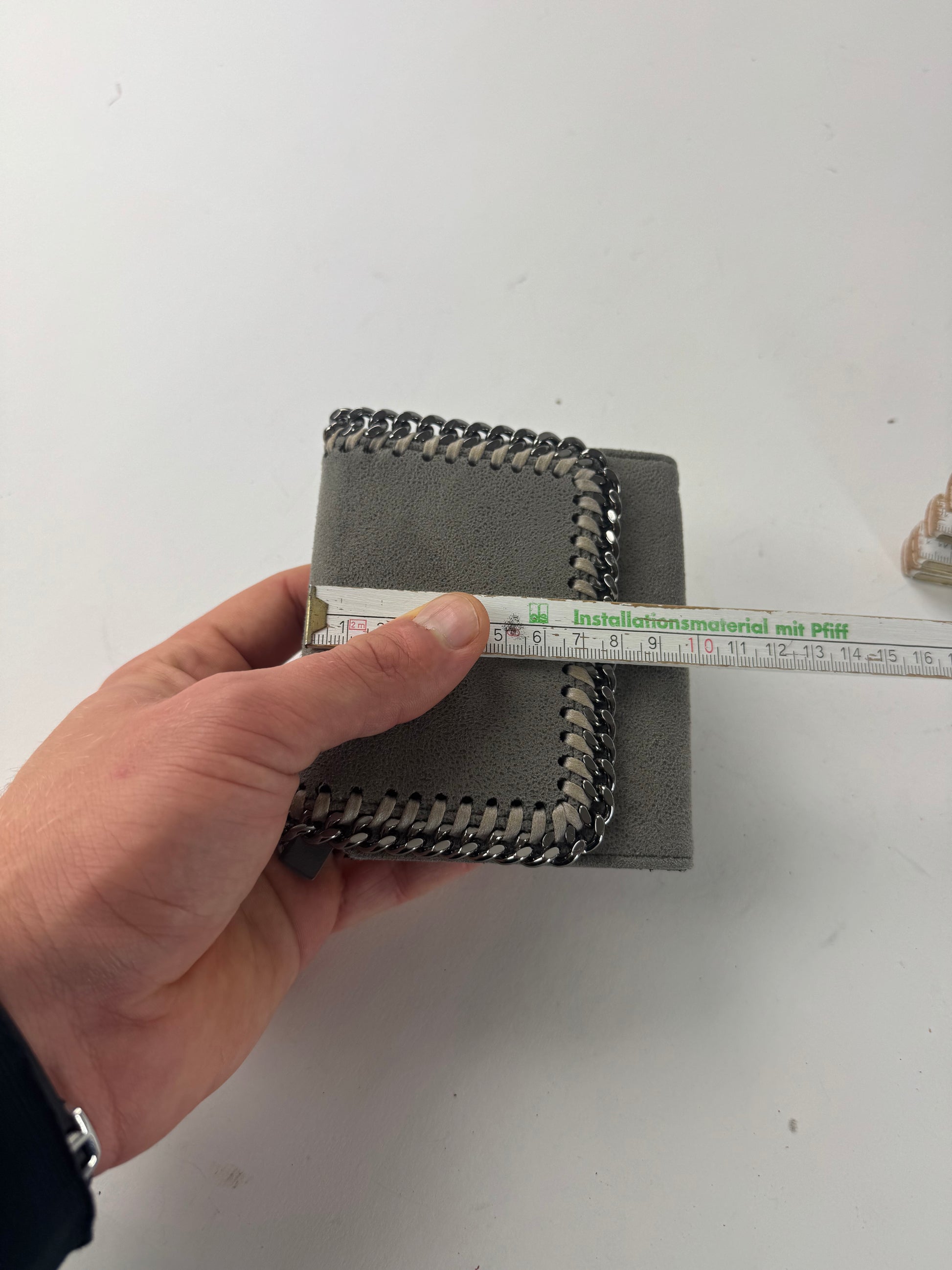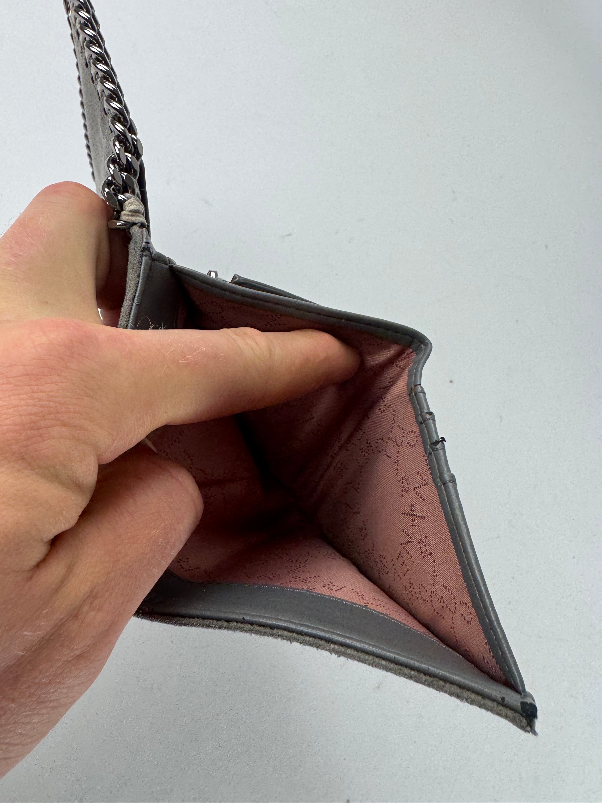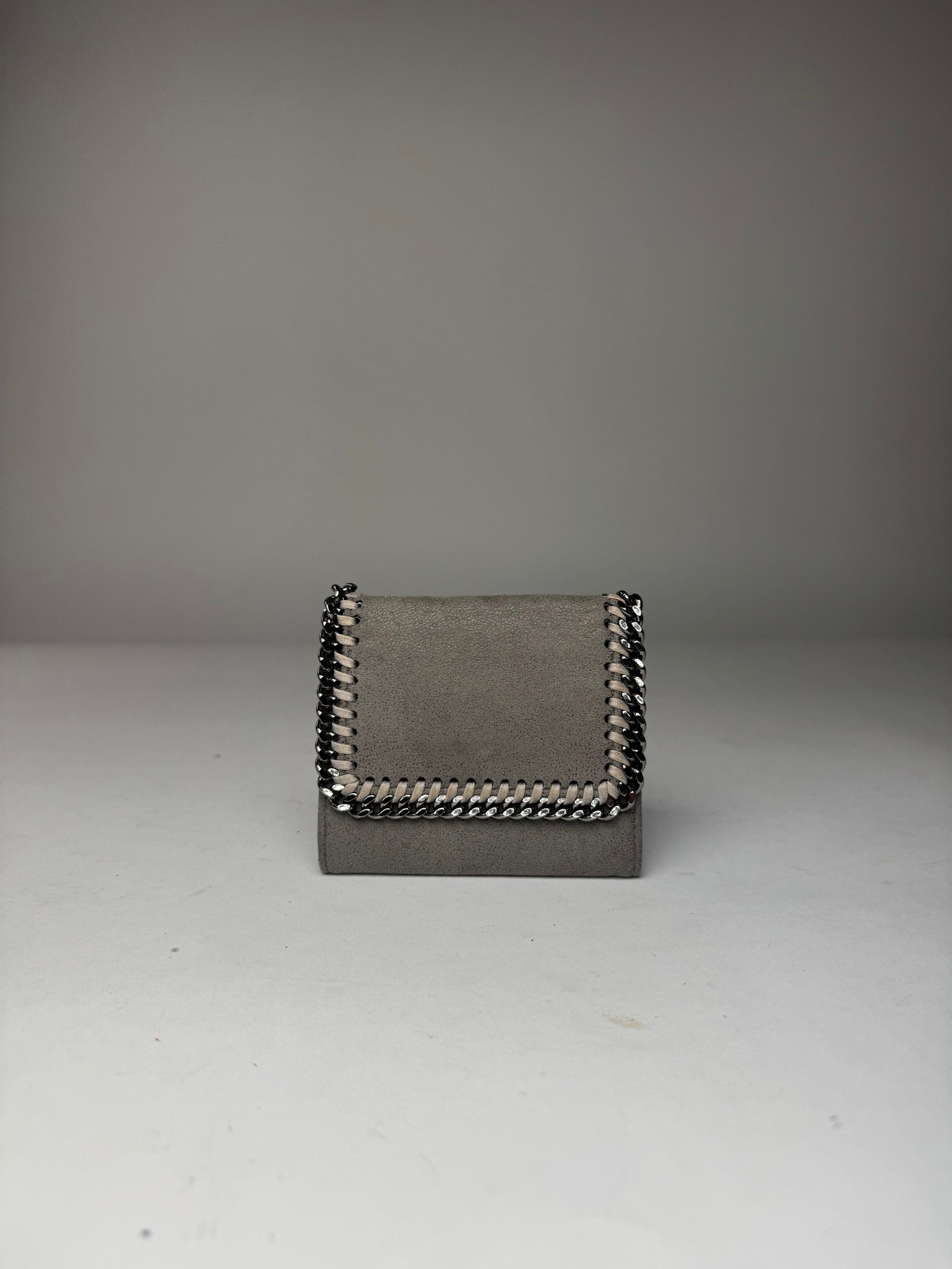 STELLA MCCARTNEY Vintage Falabella Wallet. This iconic wallet is crafted of grey vegan suede leather and reflects Stella McCartney’s commitment to cruelty-free luxury. Designed in the signature Falabella style, the brand’s most recognizable line introduced in the late 2000s, it is known for its chain-inspired aesthetic and ethical materials. The wallet features a snap button closure and silver-tone steel hardware. Made in Italy, it opens to a smooth vegan leather interior with a coral-orange polyester lining detailed with Stella McCartney logo lettering.