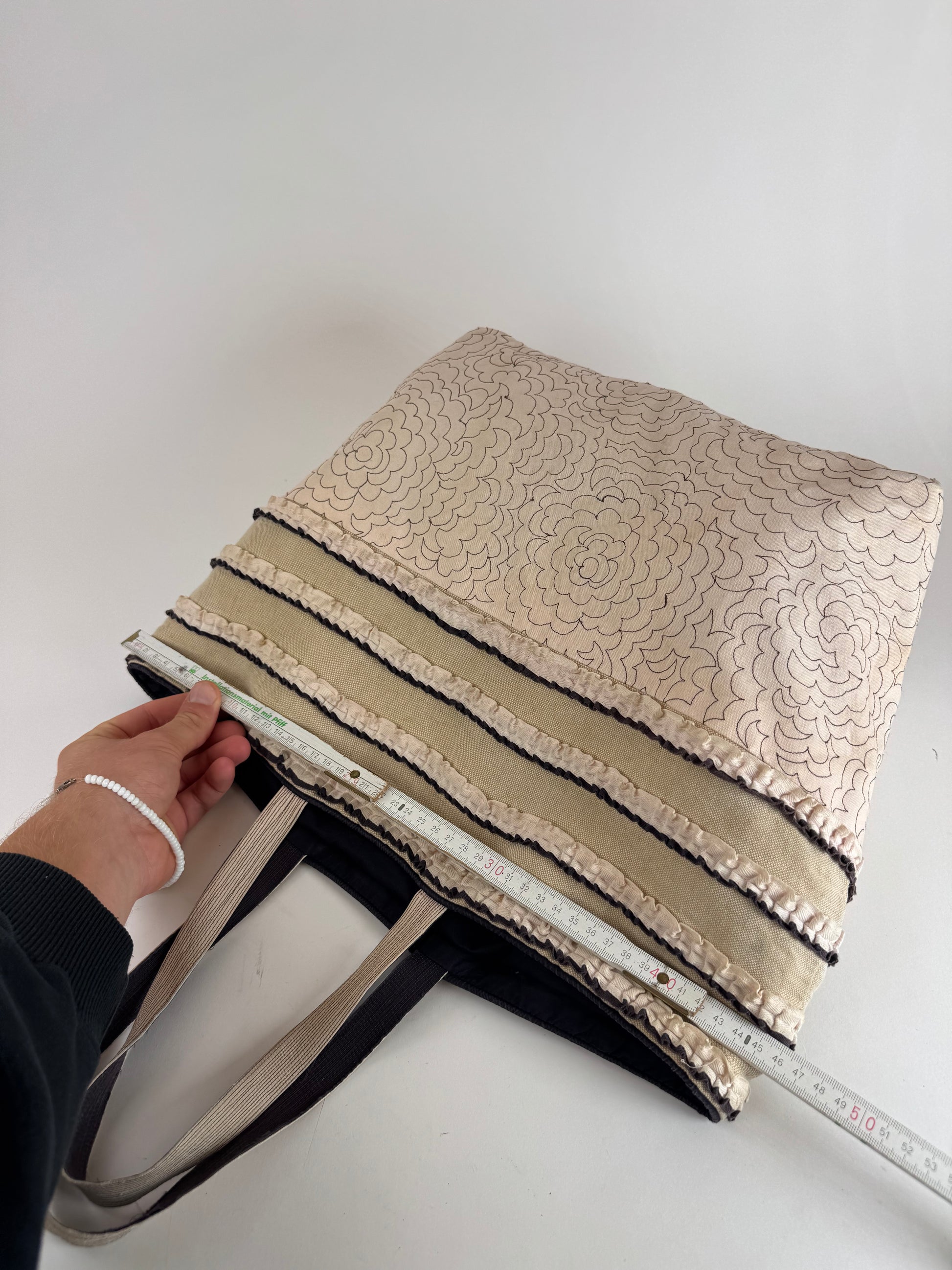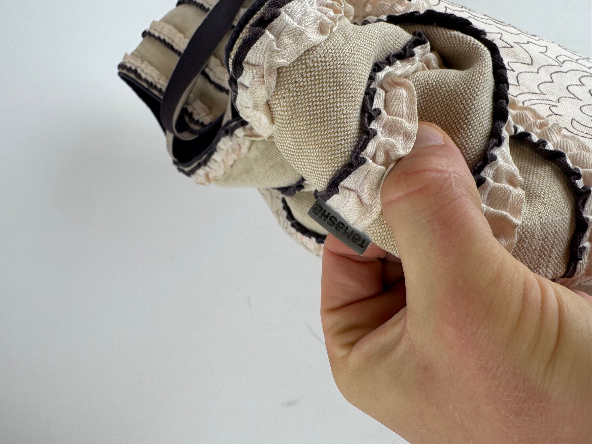 This spacious tote is finely crafted of floral-patterned canvas combined with wool-like and linen-like materials. Tamasha was a creative diffusion line by Issey Miyake, reflecting the designer’s experimental spirit and innovative approach to textiles and everyday wear. The bag features a roomy design with black canvas lining, making it both functional and unique.
