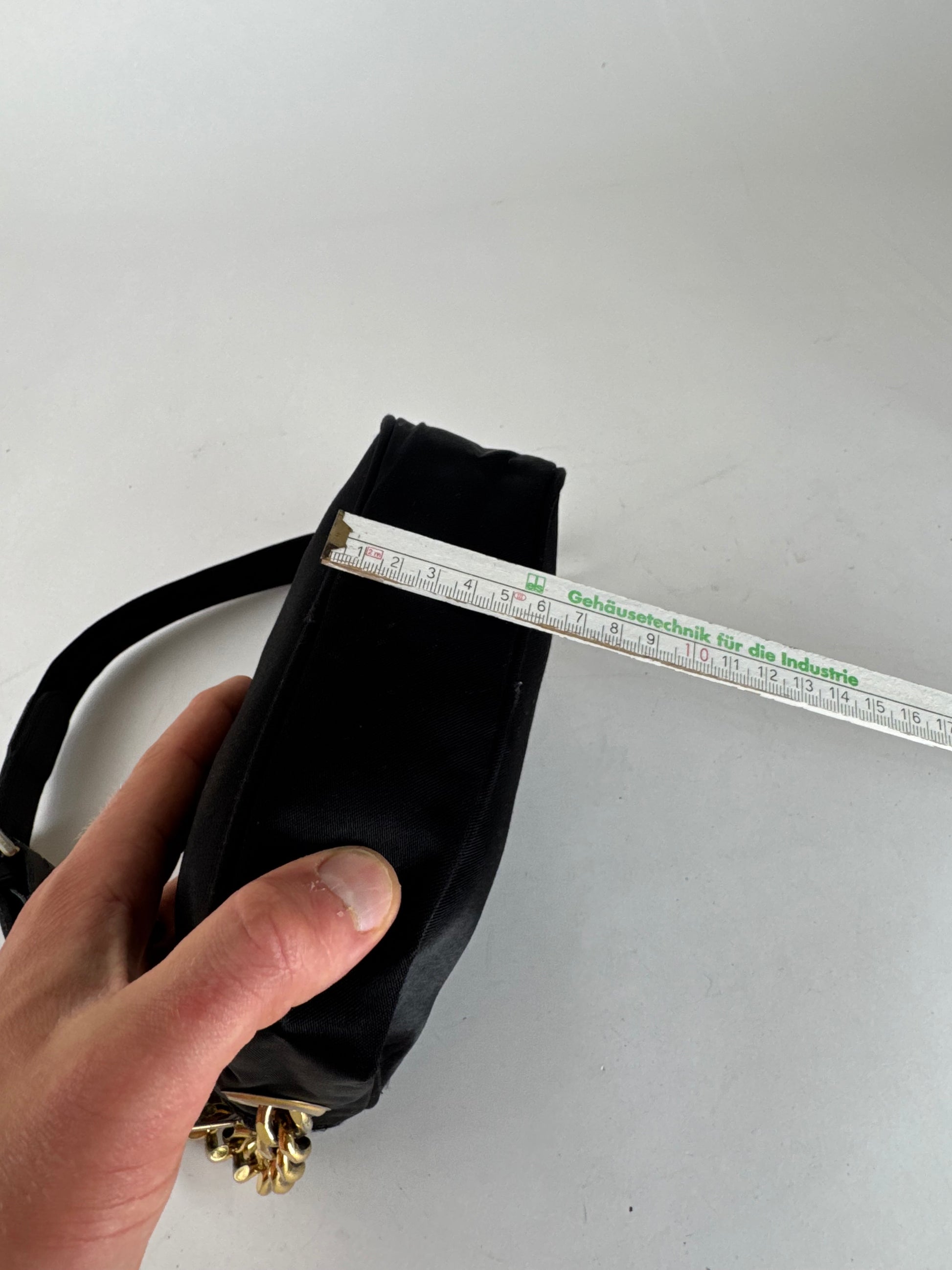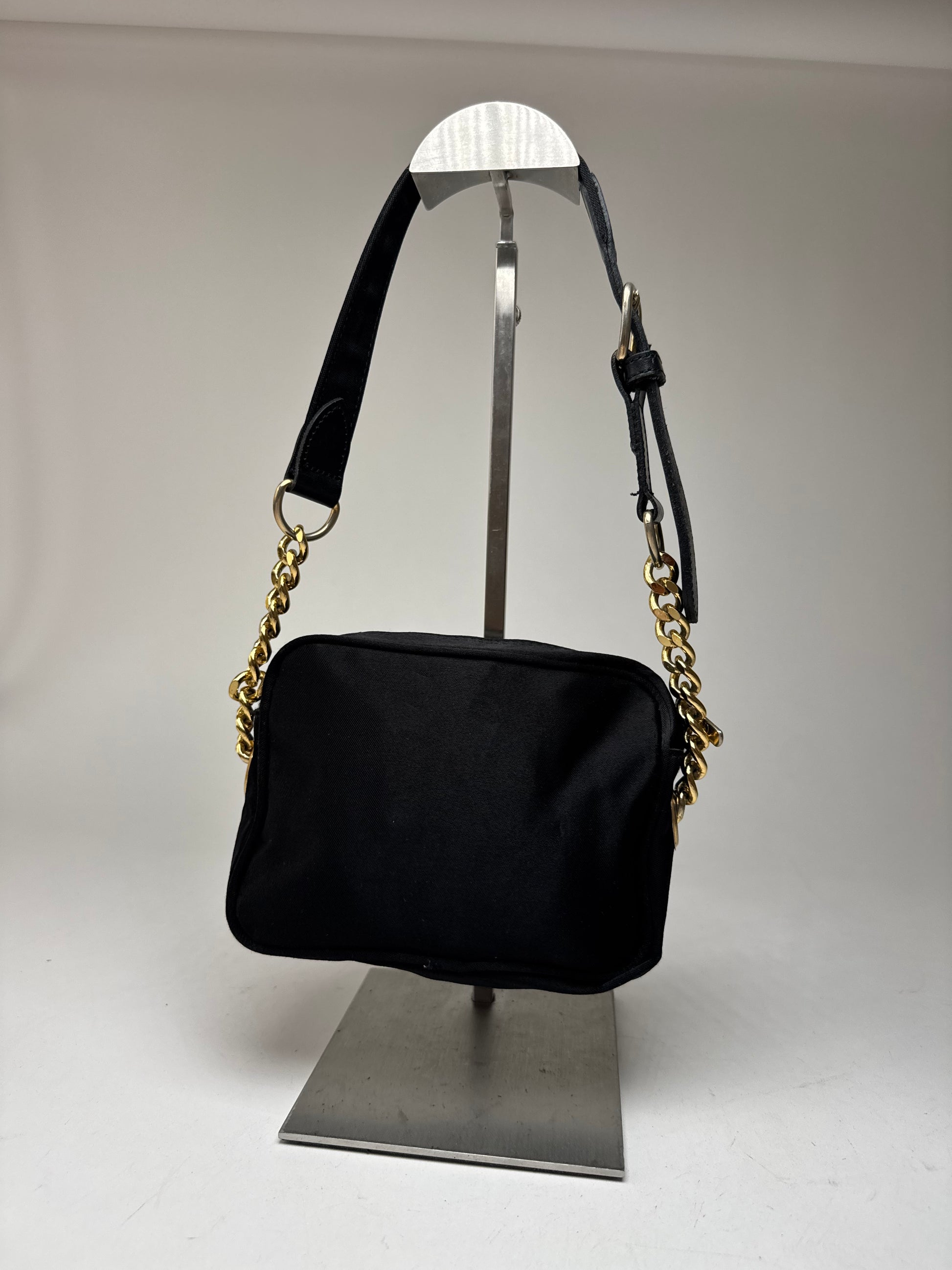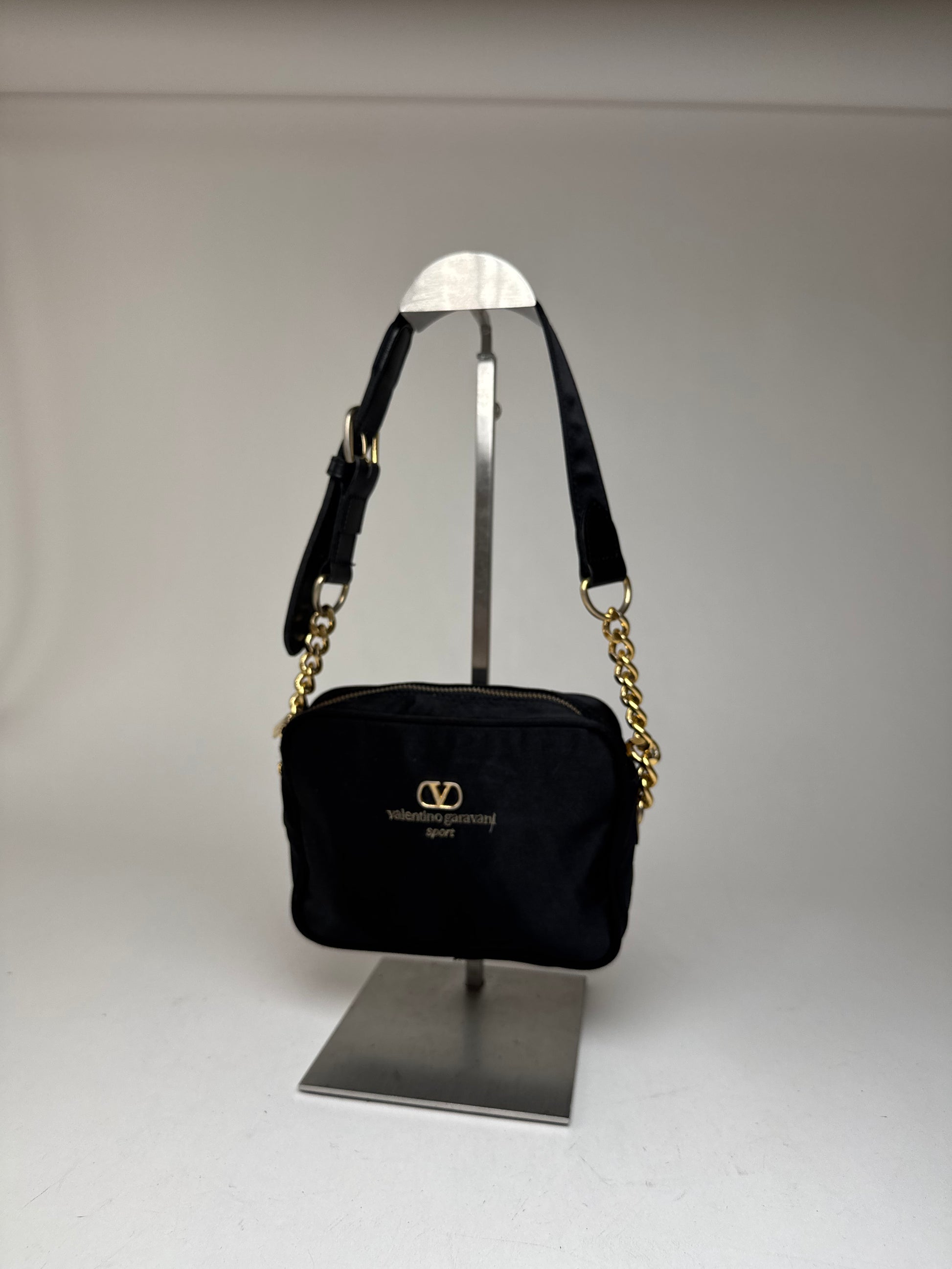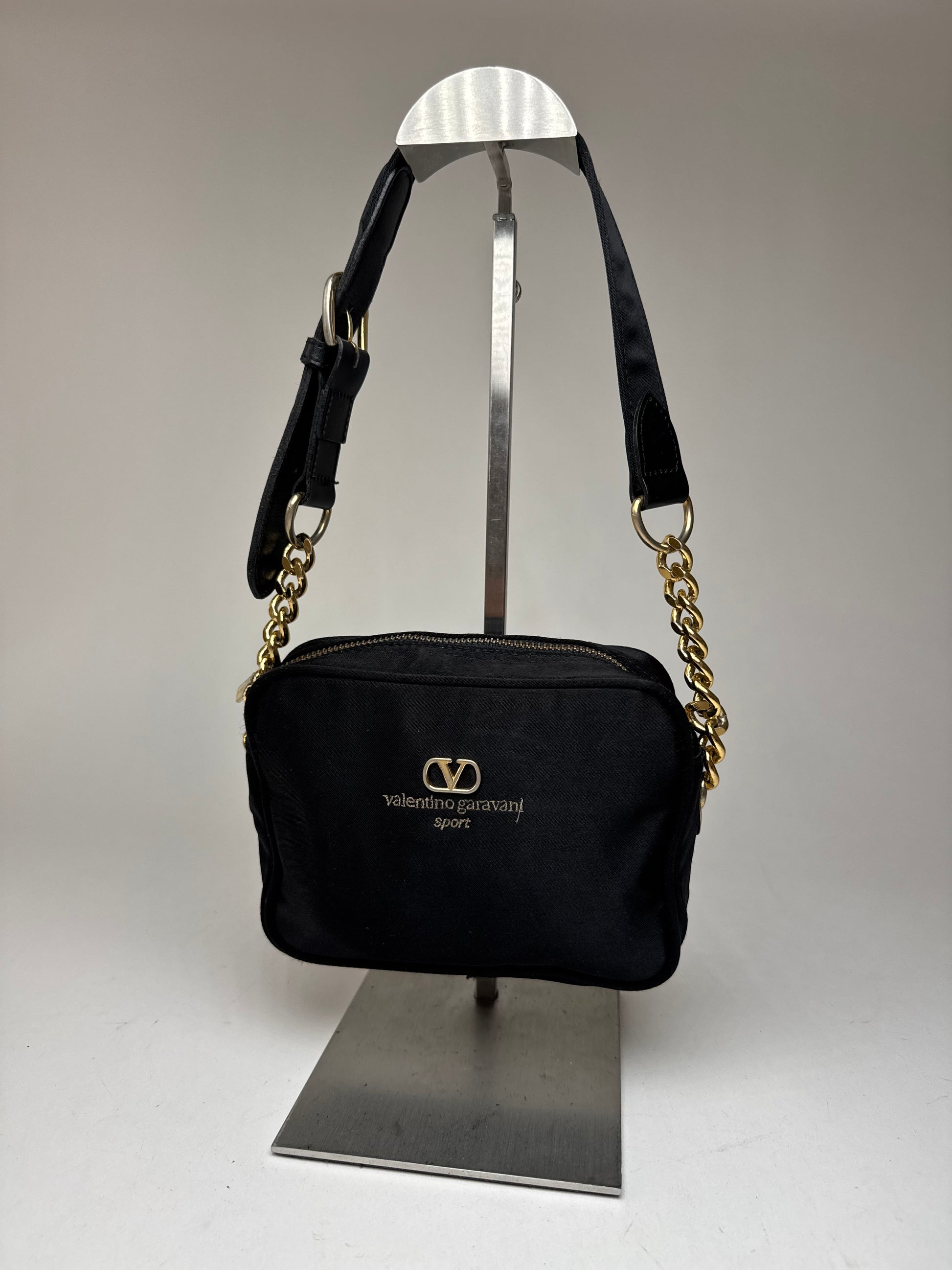 VALENTINO GARAVANI Vintage Handbag. This elegant handbag is crafted from black canvas and features a black leather strap. The design is finished with gold-tone stainless steel hardware for a refined look. The interior is lined with black polyester.