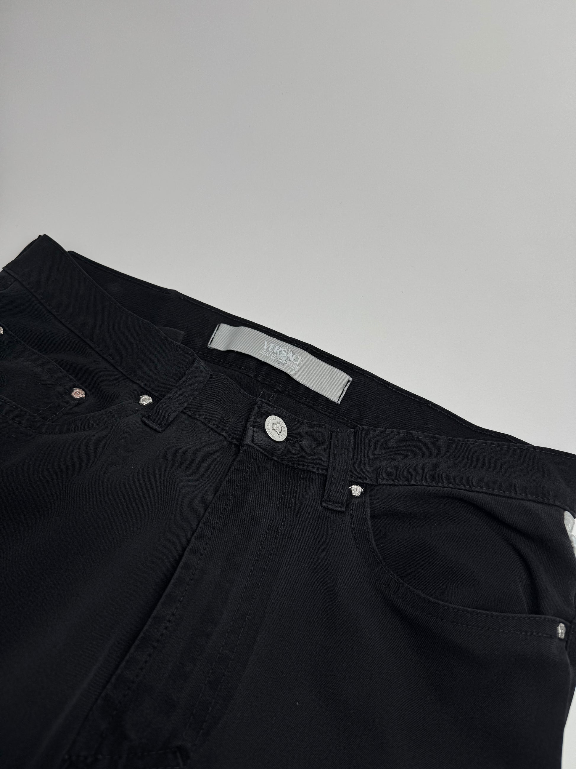 These vintage Versace pants are crafted from stretchy polyester, offering a comfortable and form-fitting silhouette. The design is complemented by silver-toned steel hardware, adding a subtle yet sophisticated touch.