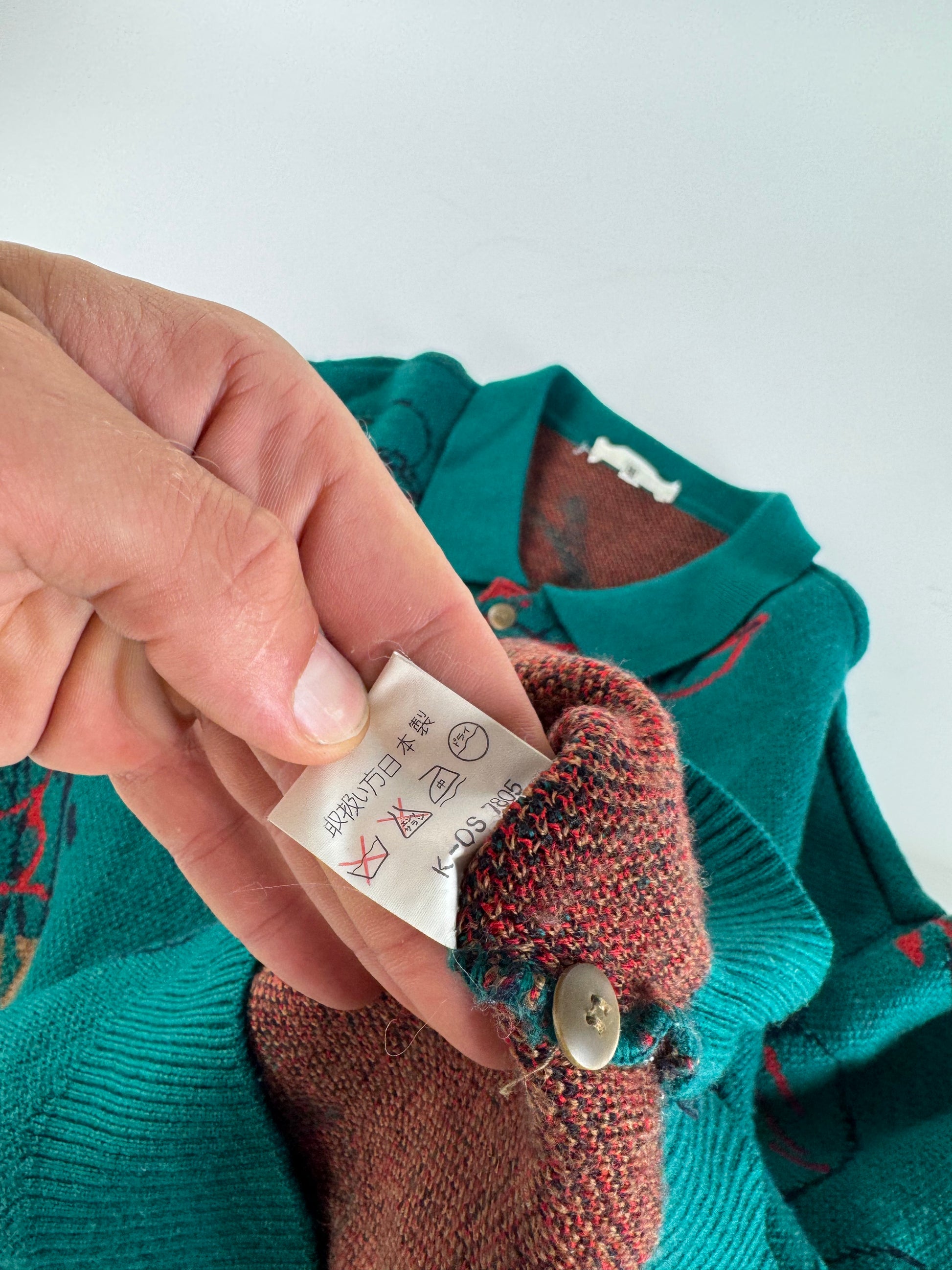 Condition Details: The cotton knit remains thick and vibrant. There are two small holes on the front and two on the back, but they can be repaired by a tailor. Overall in very good vintage condition.