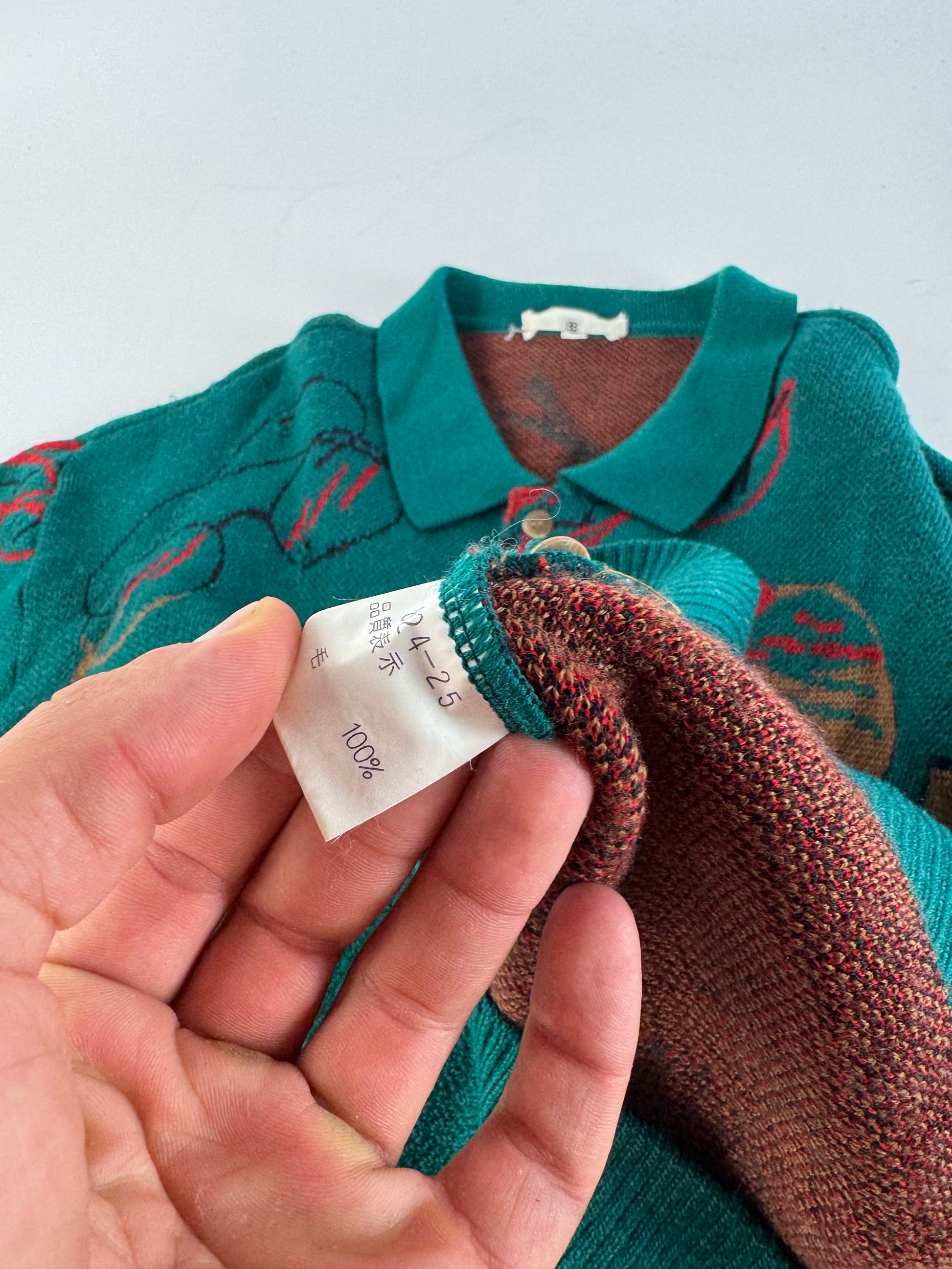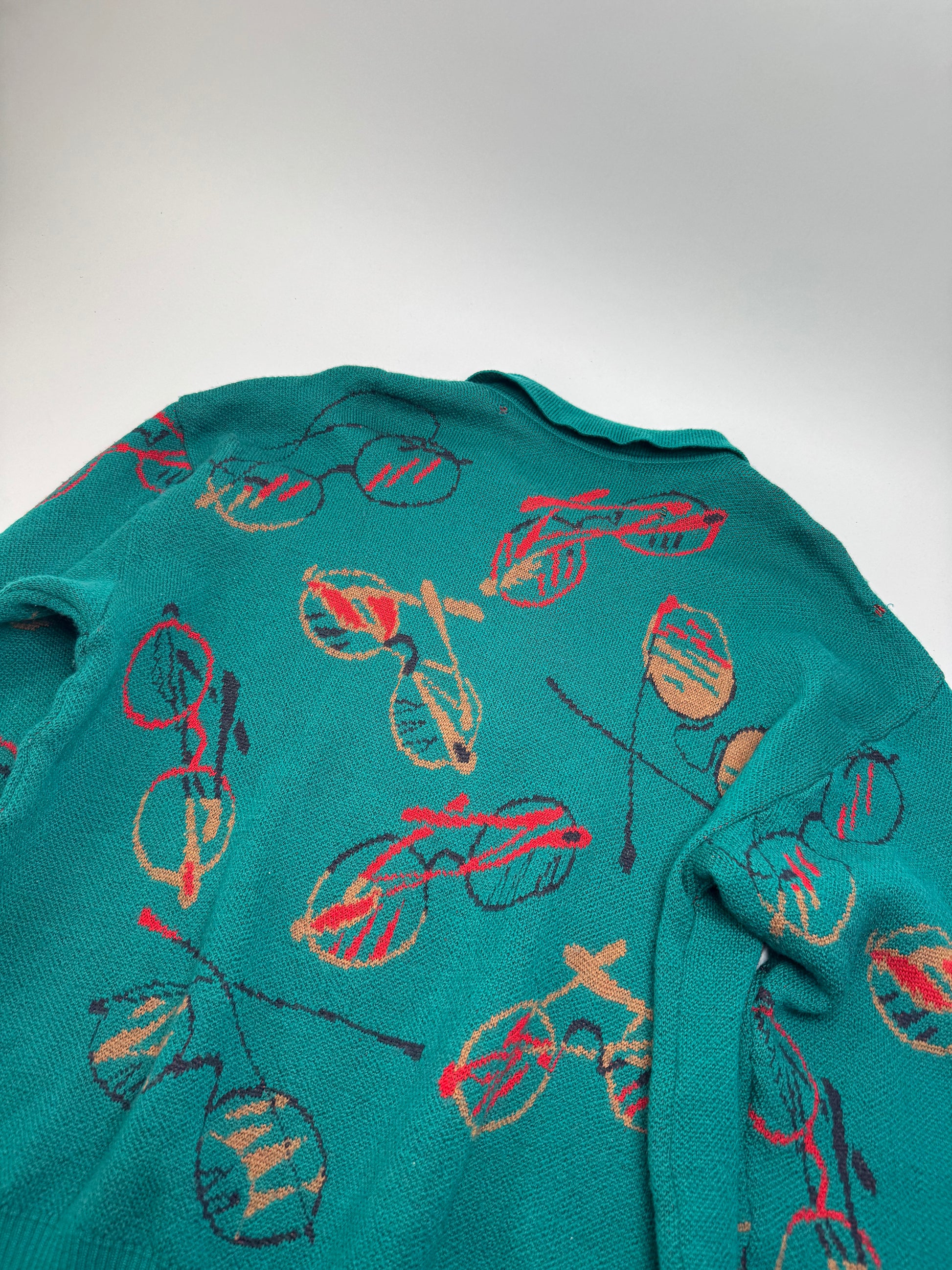 This chic sweater is finely crafted of thick cotton with a green base, decorated with yellow, black, and red eyeglass motifs. The design features a shirt collar. Likely from the 1970s or 1980s.