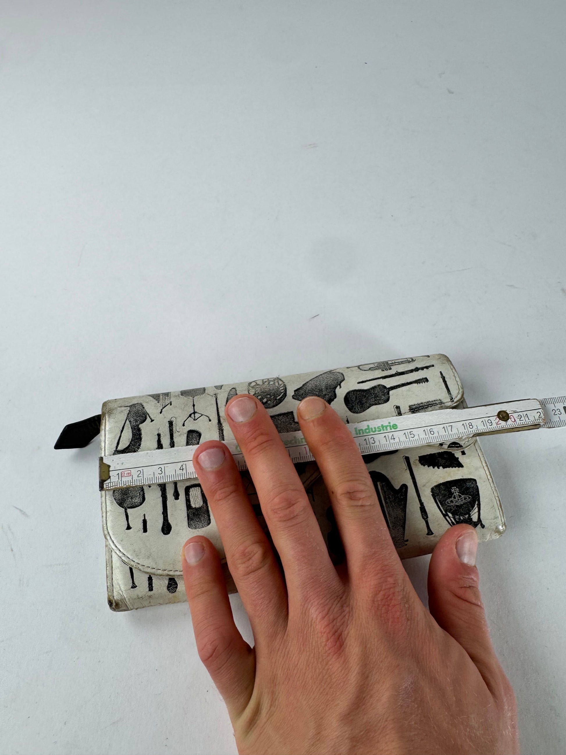 VIVIENNE WESTWOOD Vintage Saddlebag Leather Wallet. This statement vintage wallet is crafted from white leather in a distinctive saddlebag-inspired shape and features abstract black graphic motifs, including trumpets, keyboards, Vivienne Westwood handbags, guitars, shoes, horns, and other playful elements. Known for blending punk culture with high fashion since the 1970s, Vivienne Westwood uses bold iconography to challenge convention while celebrating creativity and rebellion.