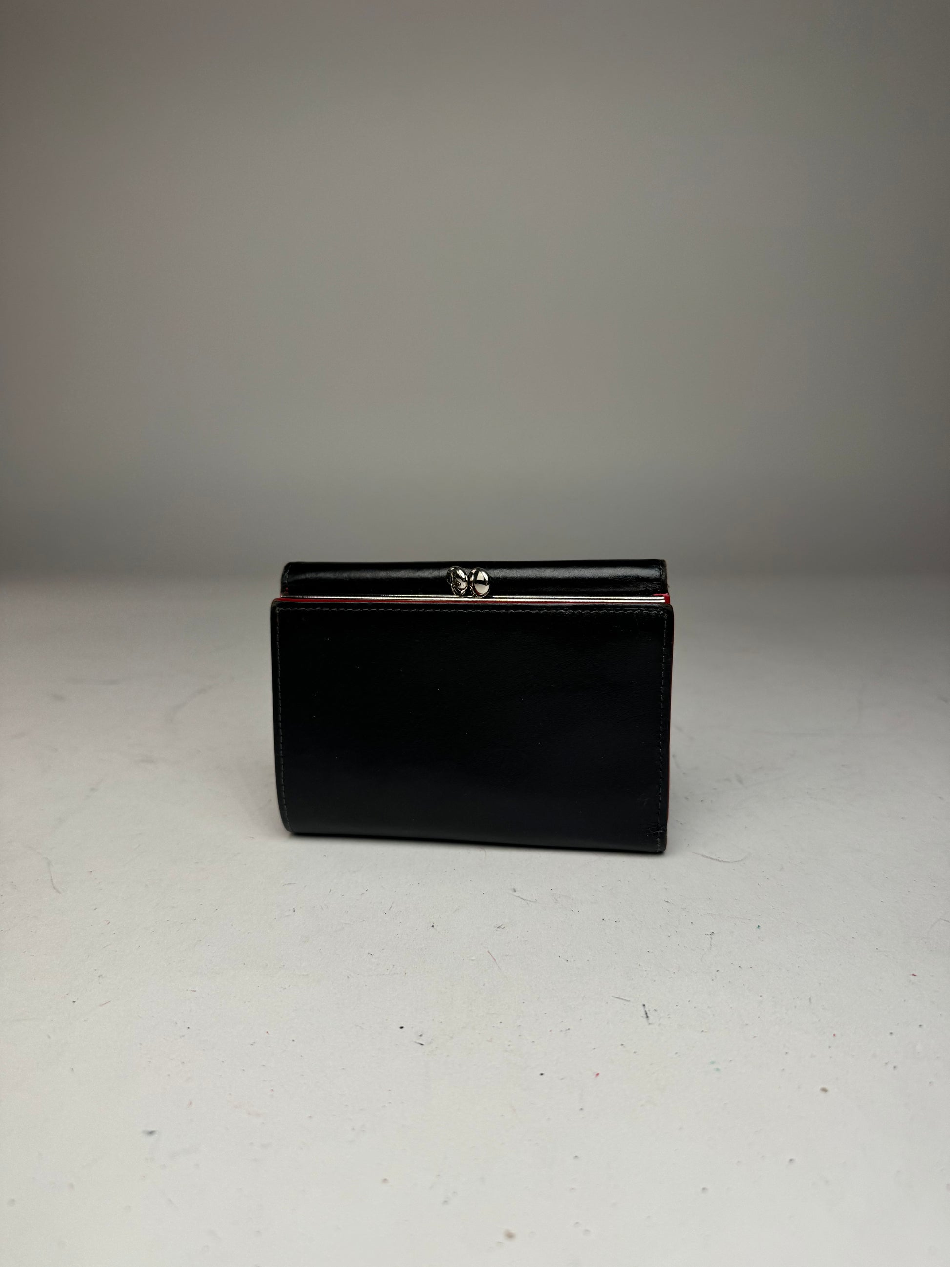 This vintage Vivienne Westwood wallet is crafted in black leather and features a front snap-button closure accented with the brand’s signature Saturn orb logo in silver-tone steel. The interior opens to bold red patent leather, adding a striking contrast to the exterior. Made in Italy — a timeless piece from the punk-luxury house.