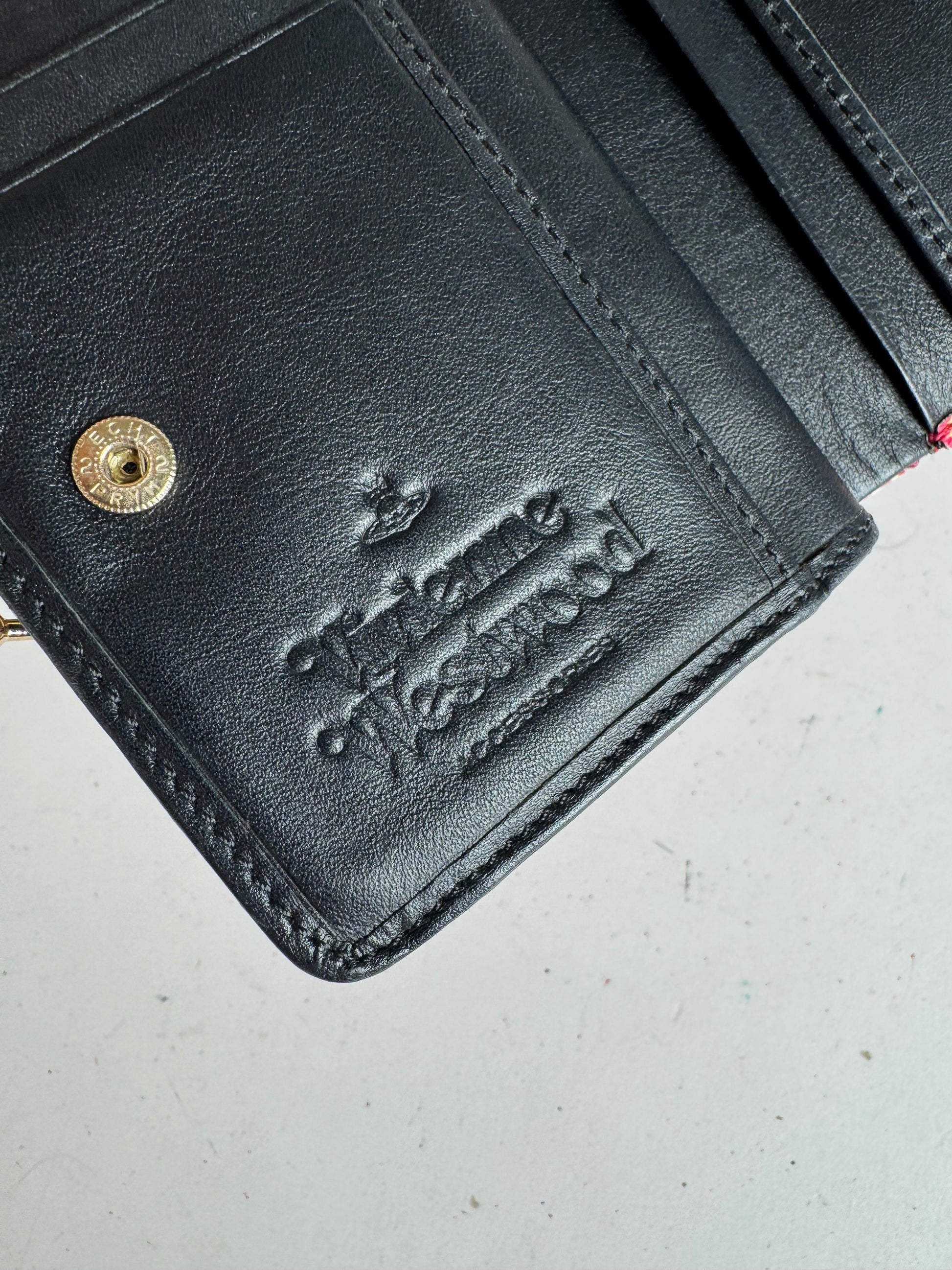 This vintage Vivienne Westwood wallet is crafted in pink-red leather with a beige Saturn-orb monogram pattern and features the iconic gold-tone orb logo on the front. It includes a front snap-button closure and a rear flap coin compartment for practical organization. The interior is lined in black leather. A rare and playful archival piece from the British punk-luxury house. Comes with the original Vivienne Westwood box and card. Made in Italy.