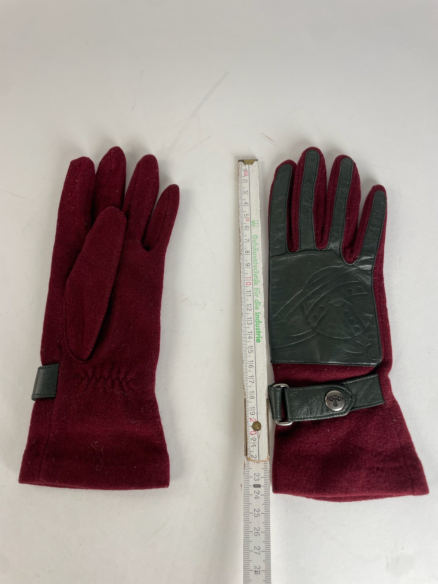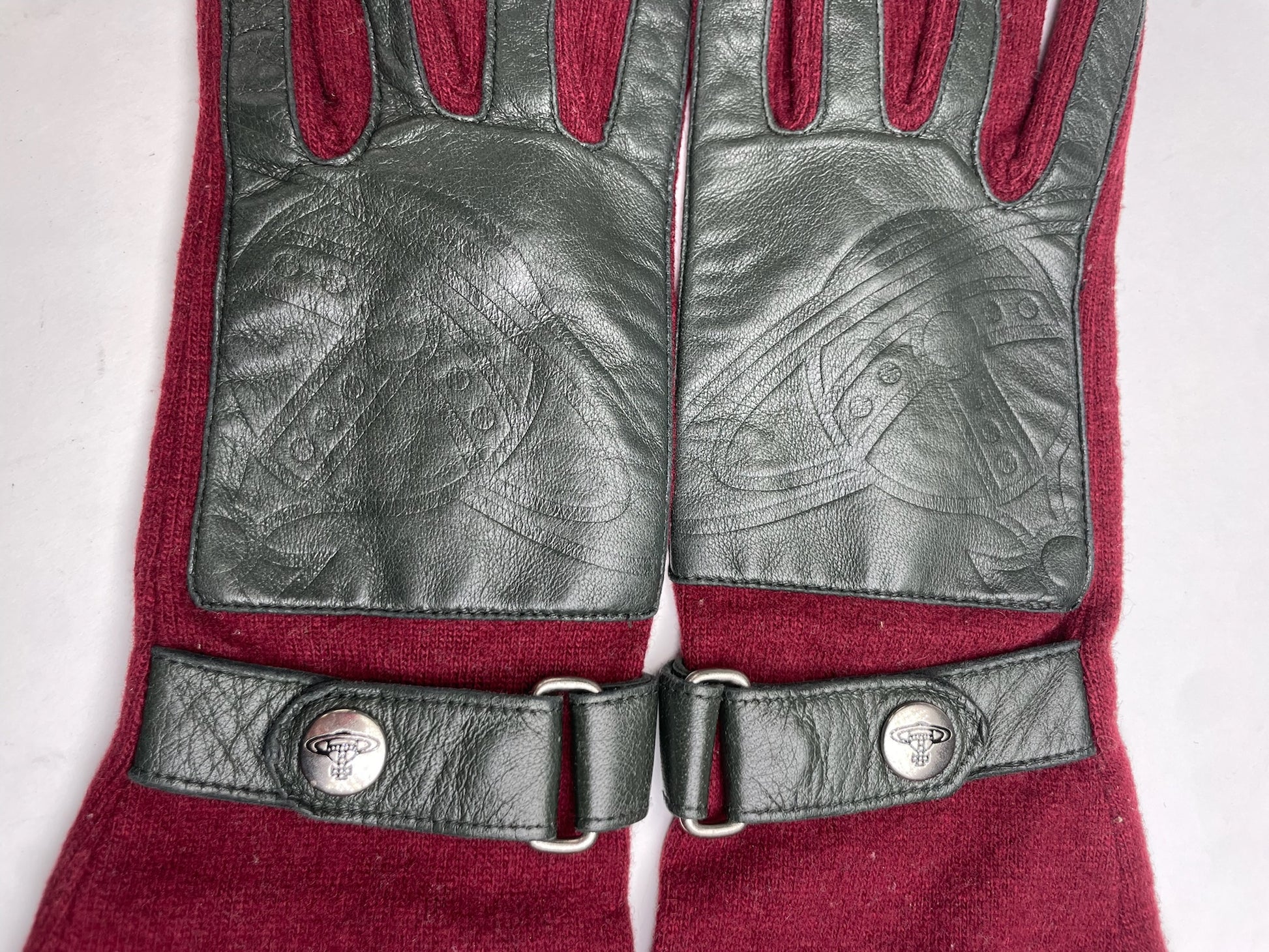 VIVIENNE WESTWOOD Vintage Wool and Leather Gloves. These distinctive vintage gloves are finely crafted of a wine-red and purple-toned wool combined with green and black leather accents. Founded in the 1970s, Vivienne Westwood became internationally renowned for redefining British fashion through punk-inspired design and iconic symbols such as the Saturn logo, which represents tradition meeting the future. The gloves feature a strap closure to adjust the fit and silver-tone steel hardware, with an embossed Saturn logo placed on the leather.