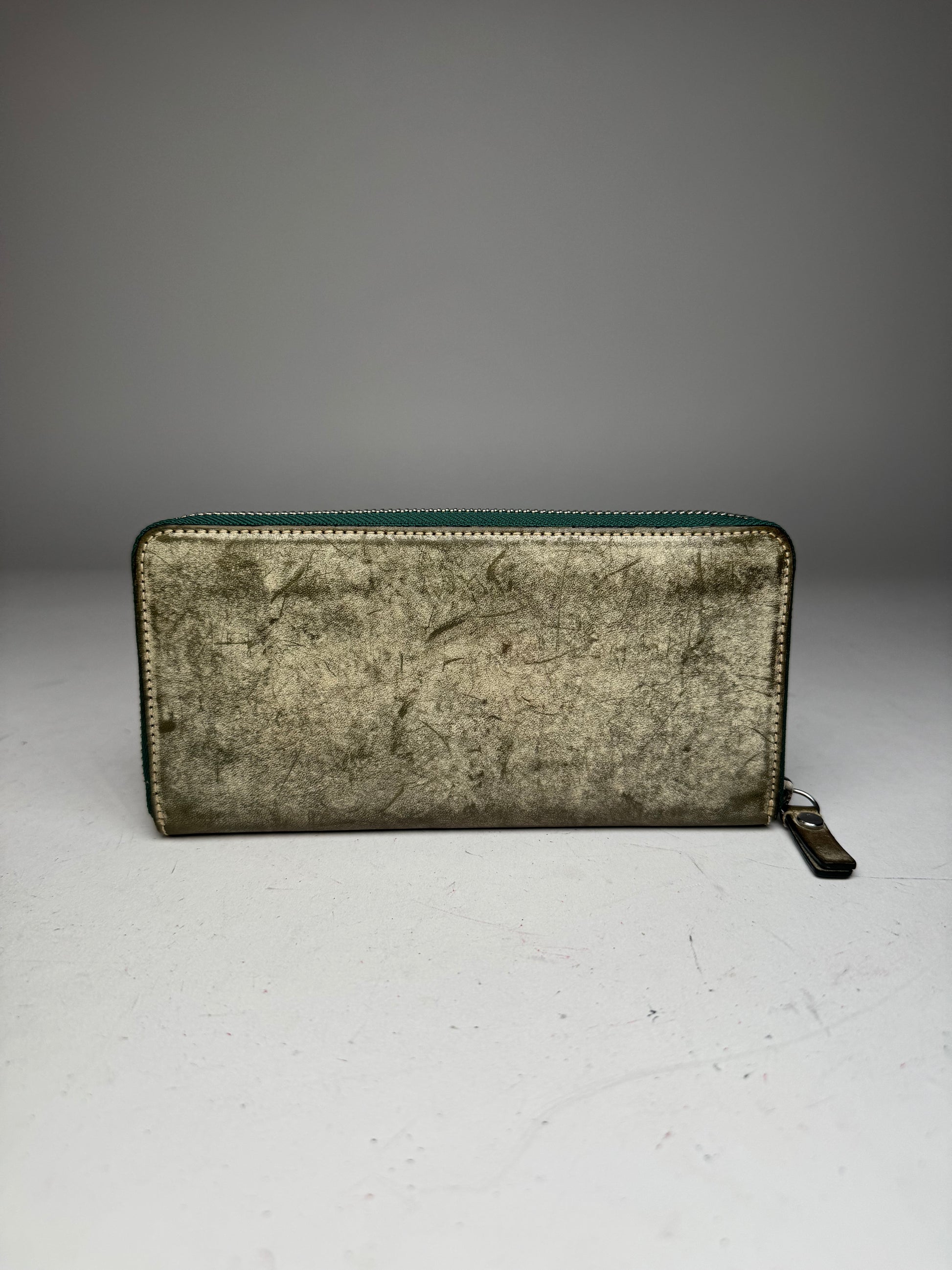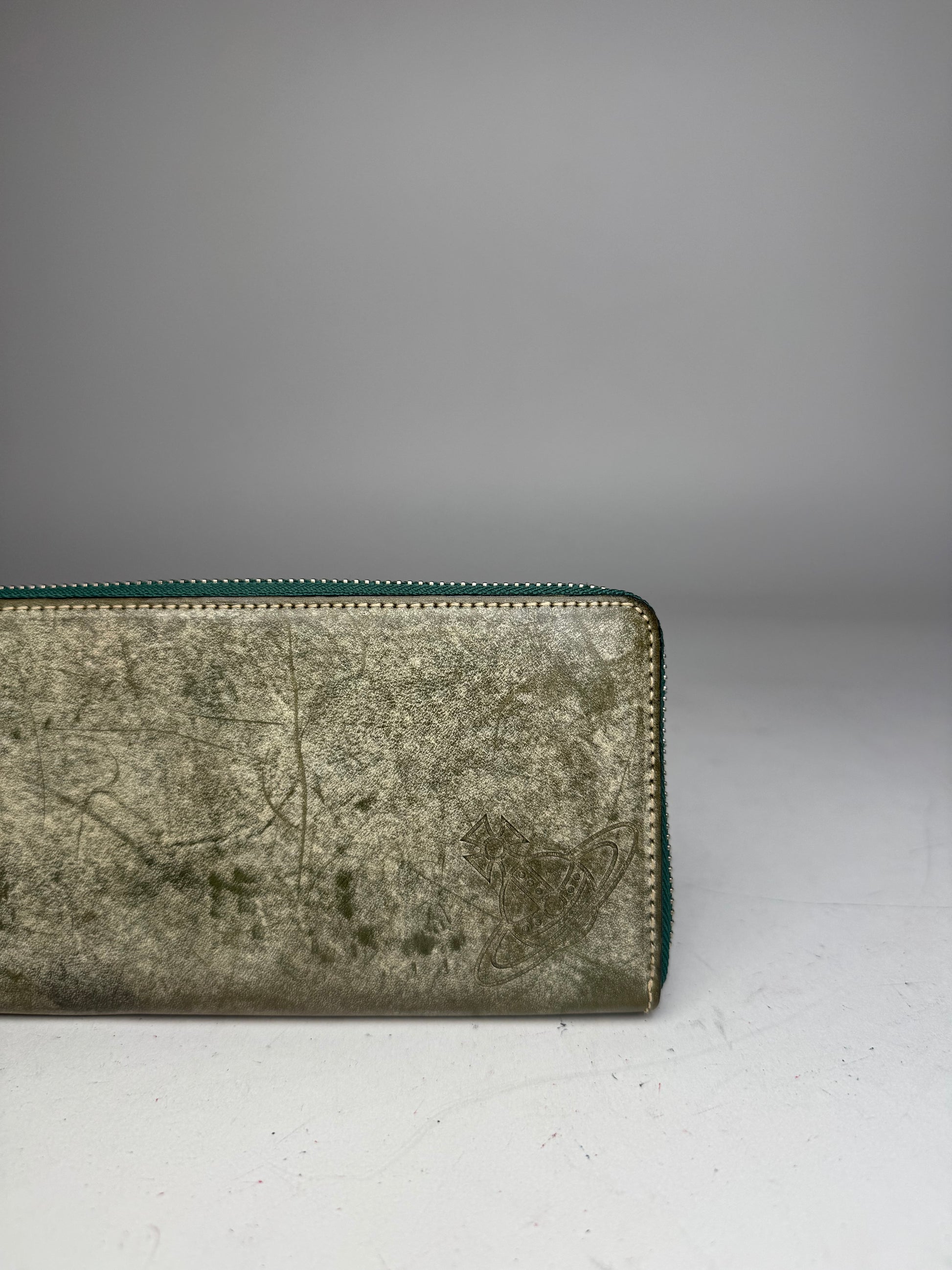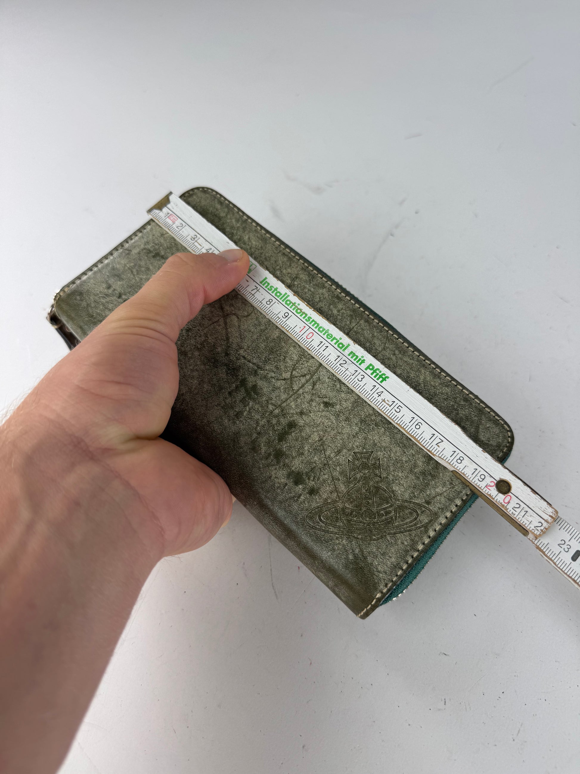 This vintage Vivienne Westwood wallet is crafted in grey-white leather and features an embossed Saturn orb logo on the front. The design includes green canvas trim and opens to a brown canvas and grey-white leather interior for a mixed-texture finish. A rare and understated archival piece from the British heritage label.