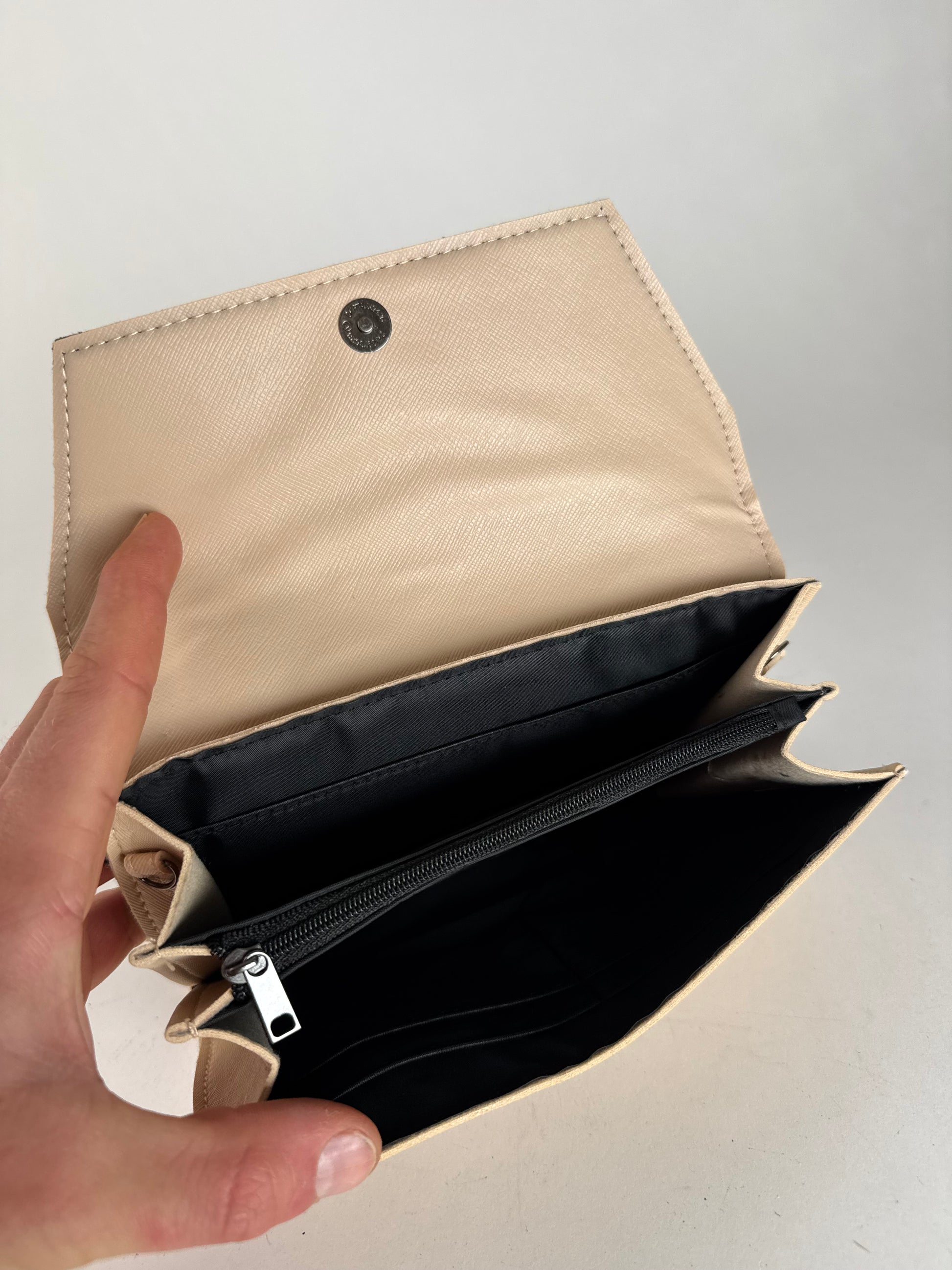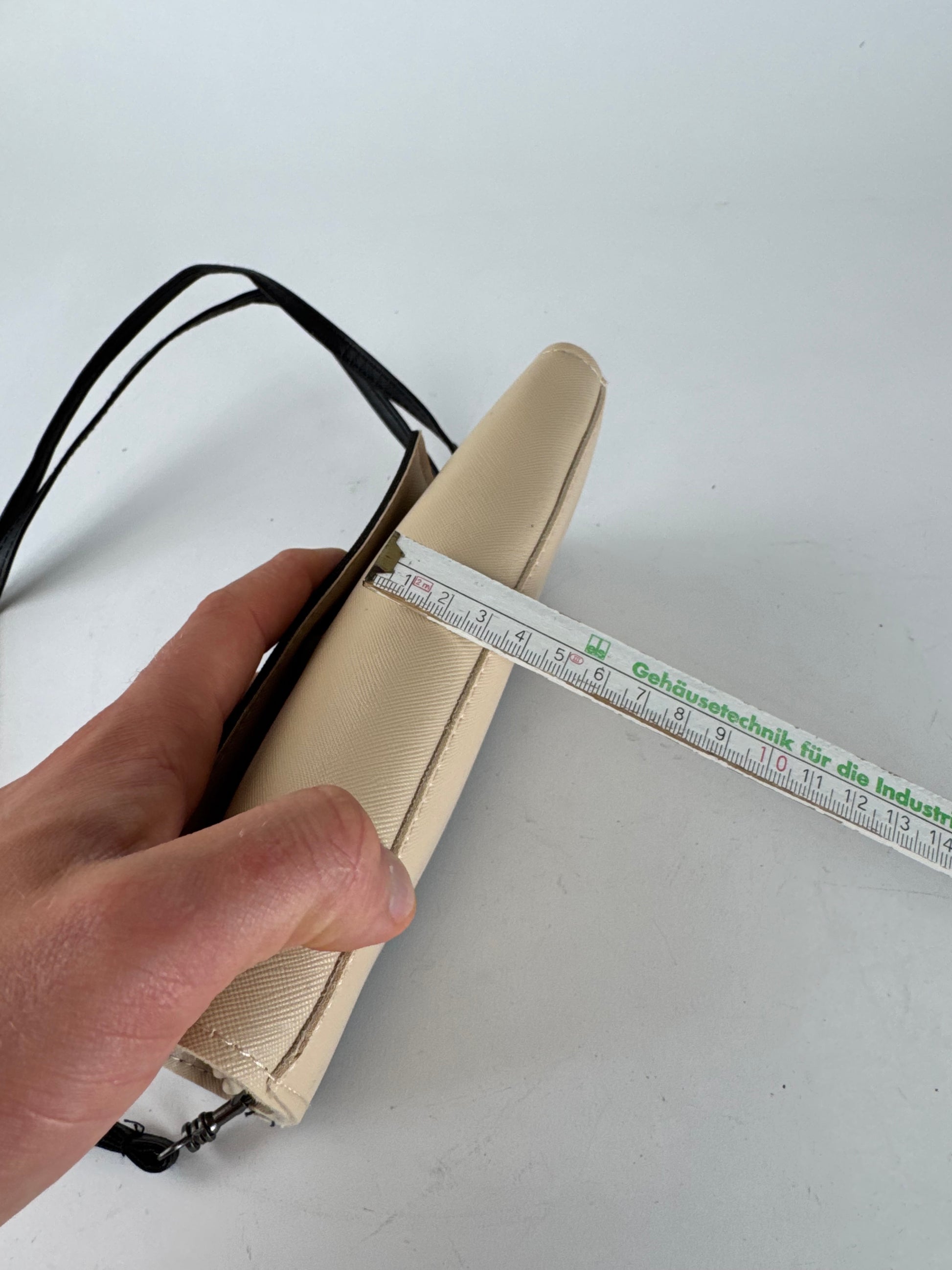 YOHJI YAMAMOTO Vintage 2-Way Handbag. This sleek handbag is crafted from beige and black leather and features a structured silhouette with a magnetic flap closure. The interior offers three compartments for organized storage. Designed as a unisex piece, it can be worn as a shoulder bag or carried by hand.