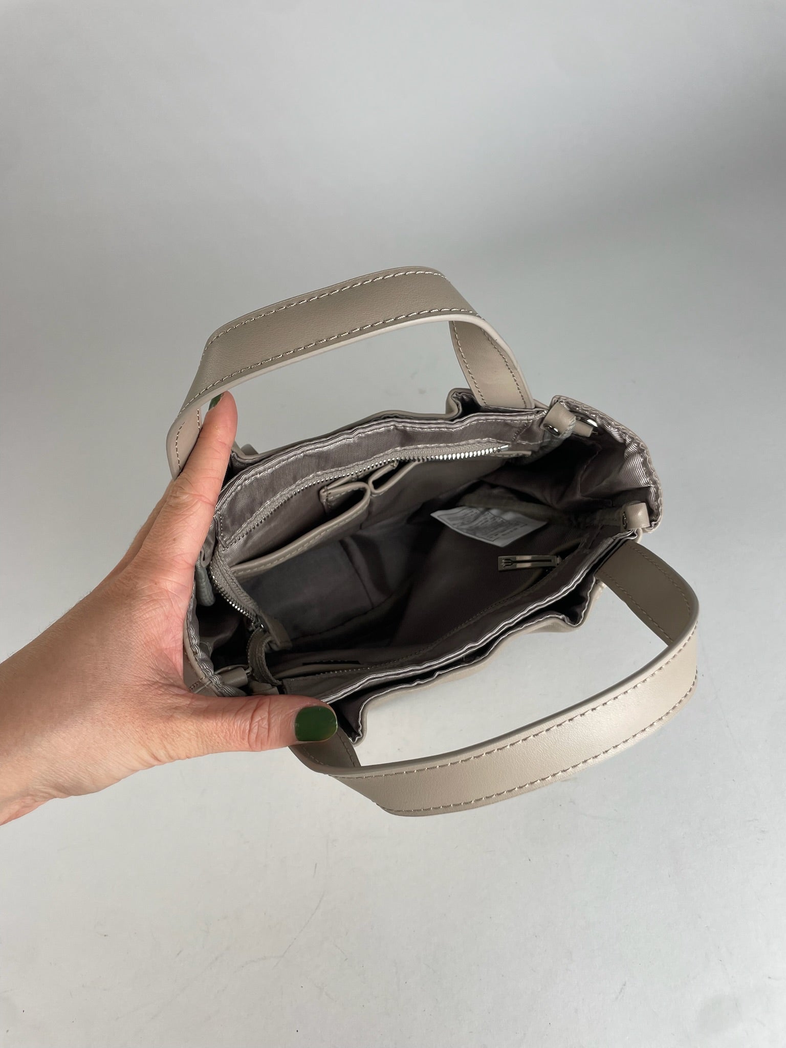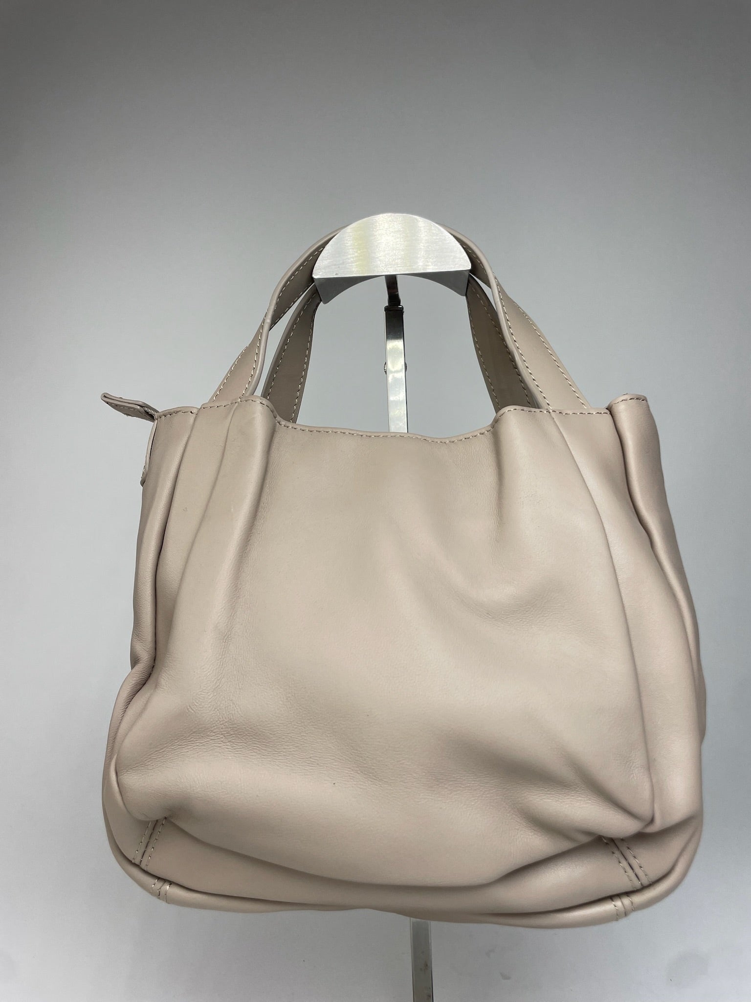 This refined vintage handbag is crafted of beige-grey leather and features two top handles, complemented by a removable and adjustable shoulder strap for versatile wear. Y’saccs was launched in the 1980s as an accessories line closely associated with Yohji Yamamoto, translating his avant-garde design philosophy into functional yet minimalist bags with a strong focus on craftsmanship and practicality. The bag is secured with a top zipper closure and opens to a brown canvas interior.