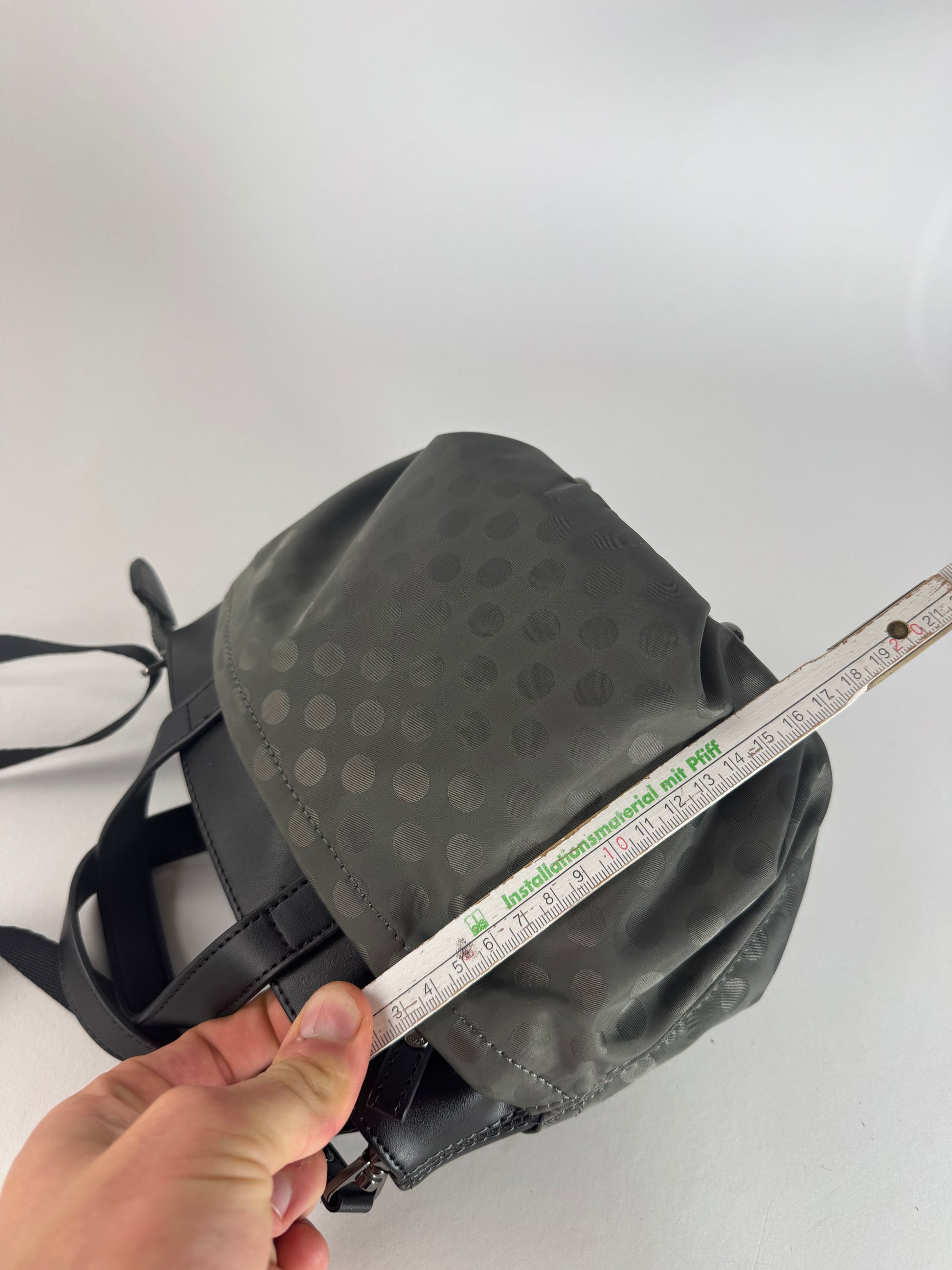 YOHJI YAMAMOTO Y-SACCS Vintage 2-Way Handbag. This distinctive vintage 2-way handbag is crafted from a synthetic polyester material featuring a silver-grey polka-dot pattern. The bag is part of Y-SACCS, a sub-label associated with Yohji Yamamoto, known for translating the designer’s avant-garde aesthetic into functional, minimalist accessories with a focus on innovative materials and everyday usability. The bag features two black leather top handles and a top zipper closure. It opens to a gold-beige canvas interior.