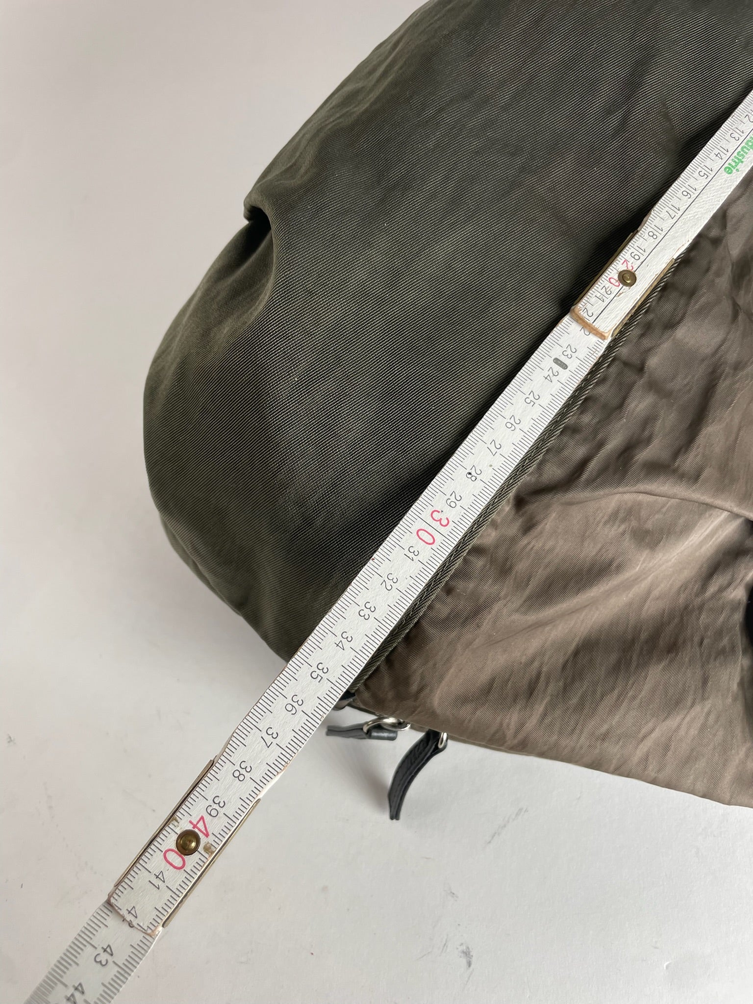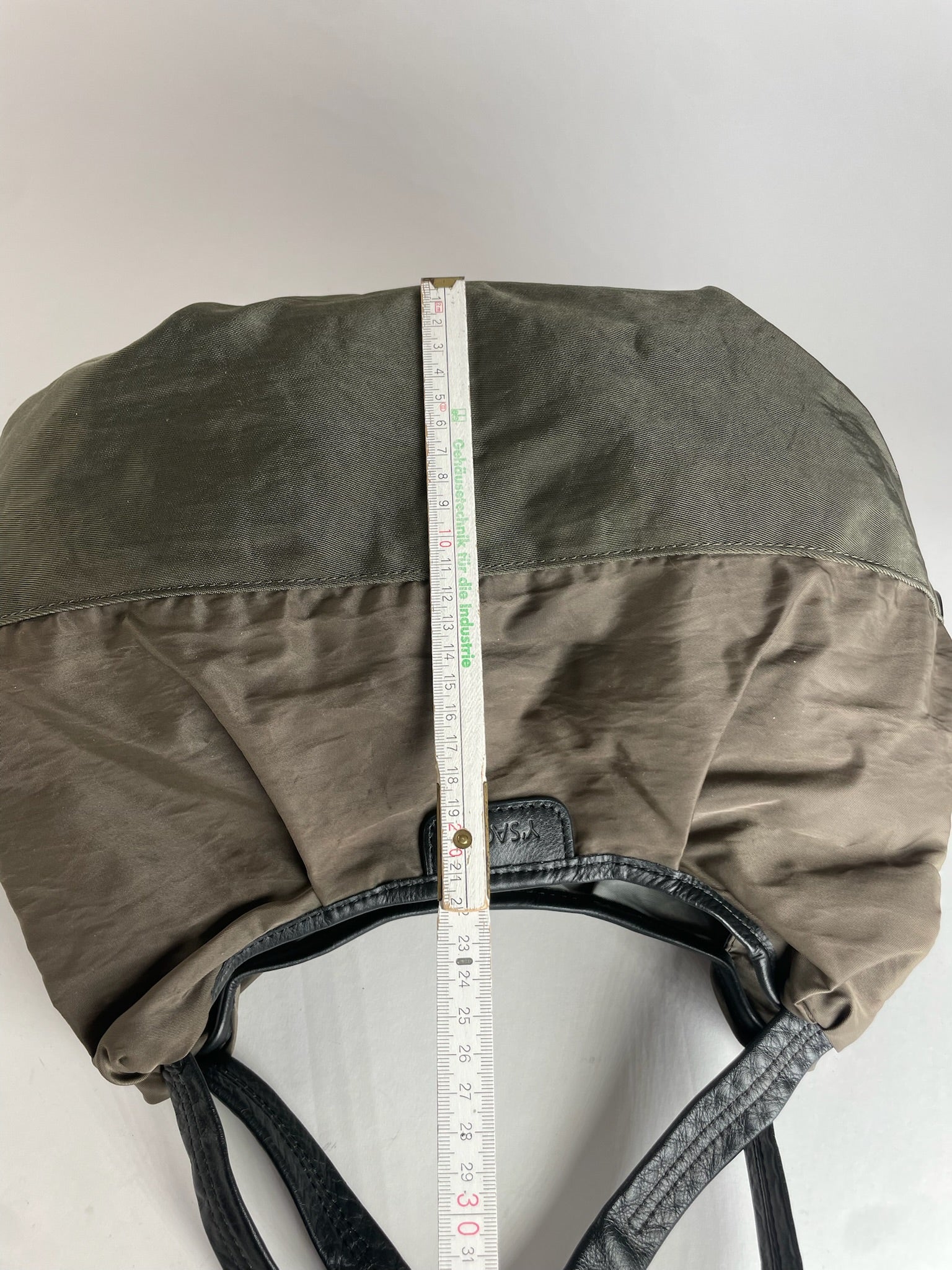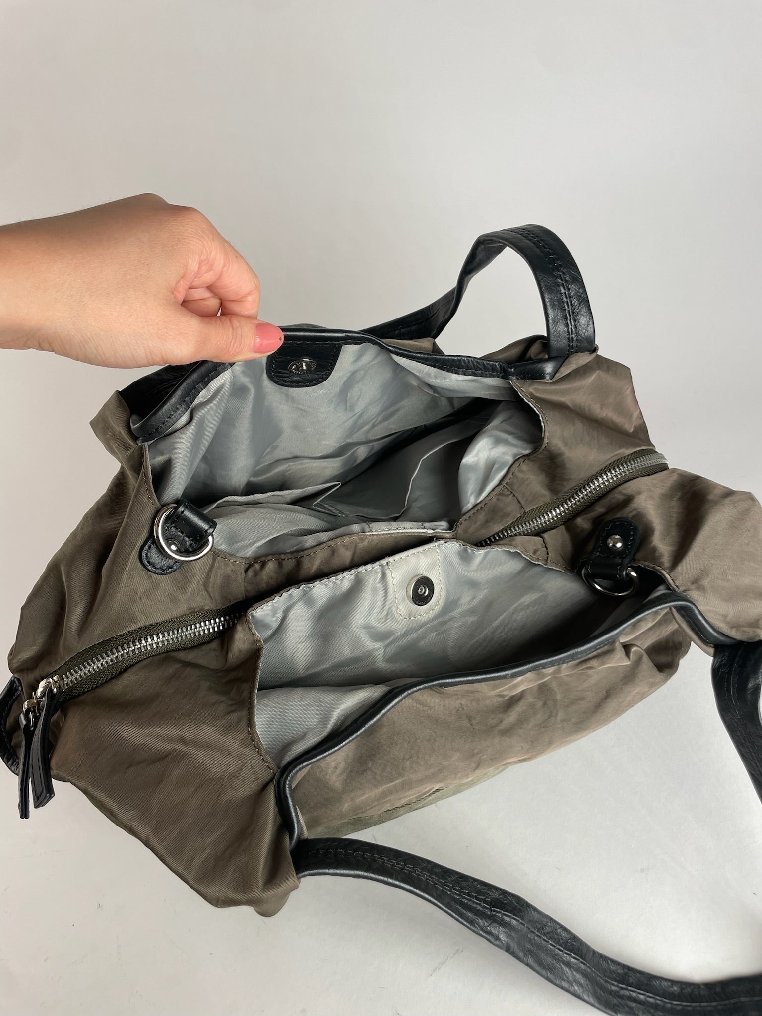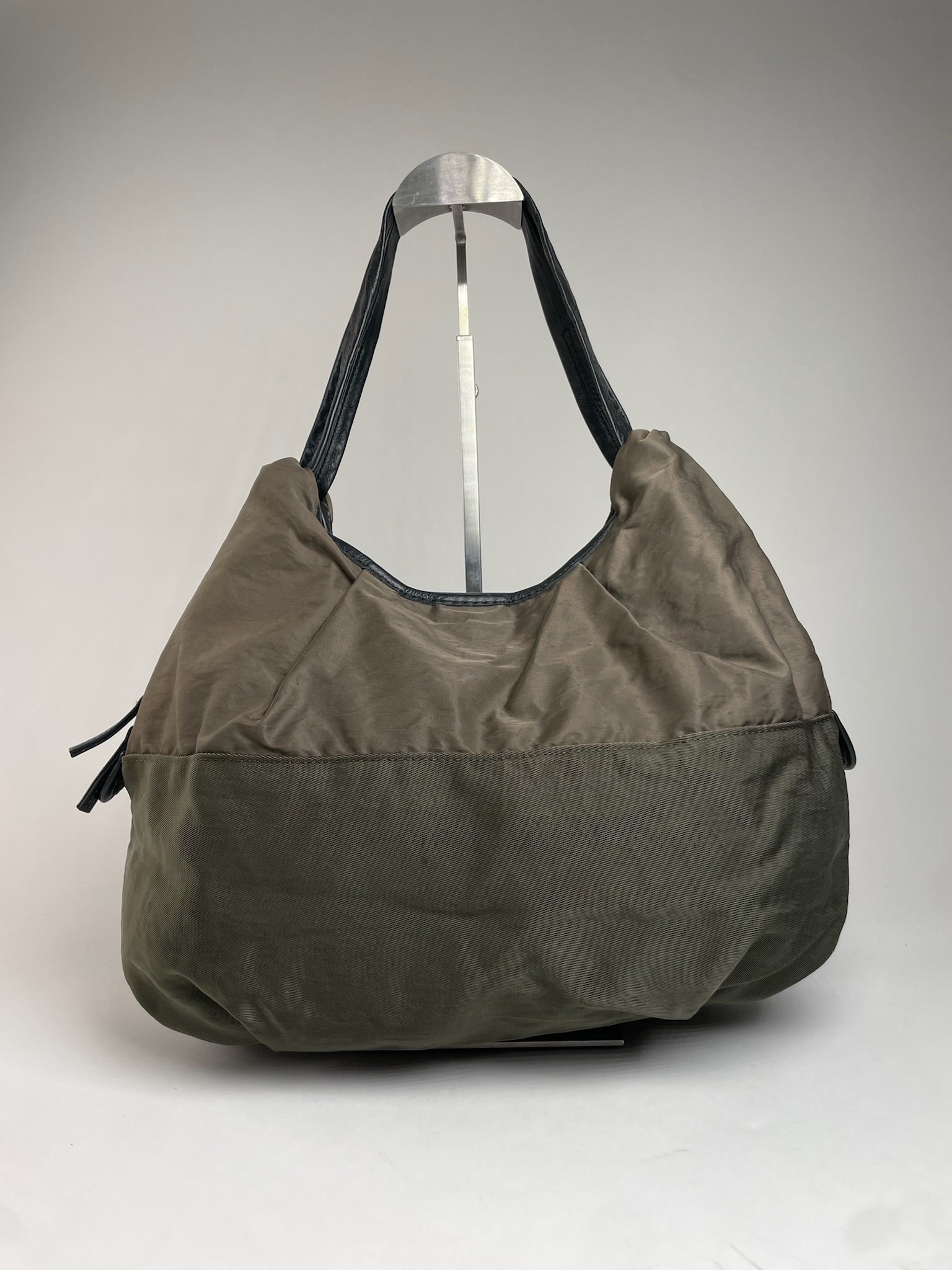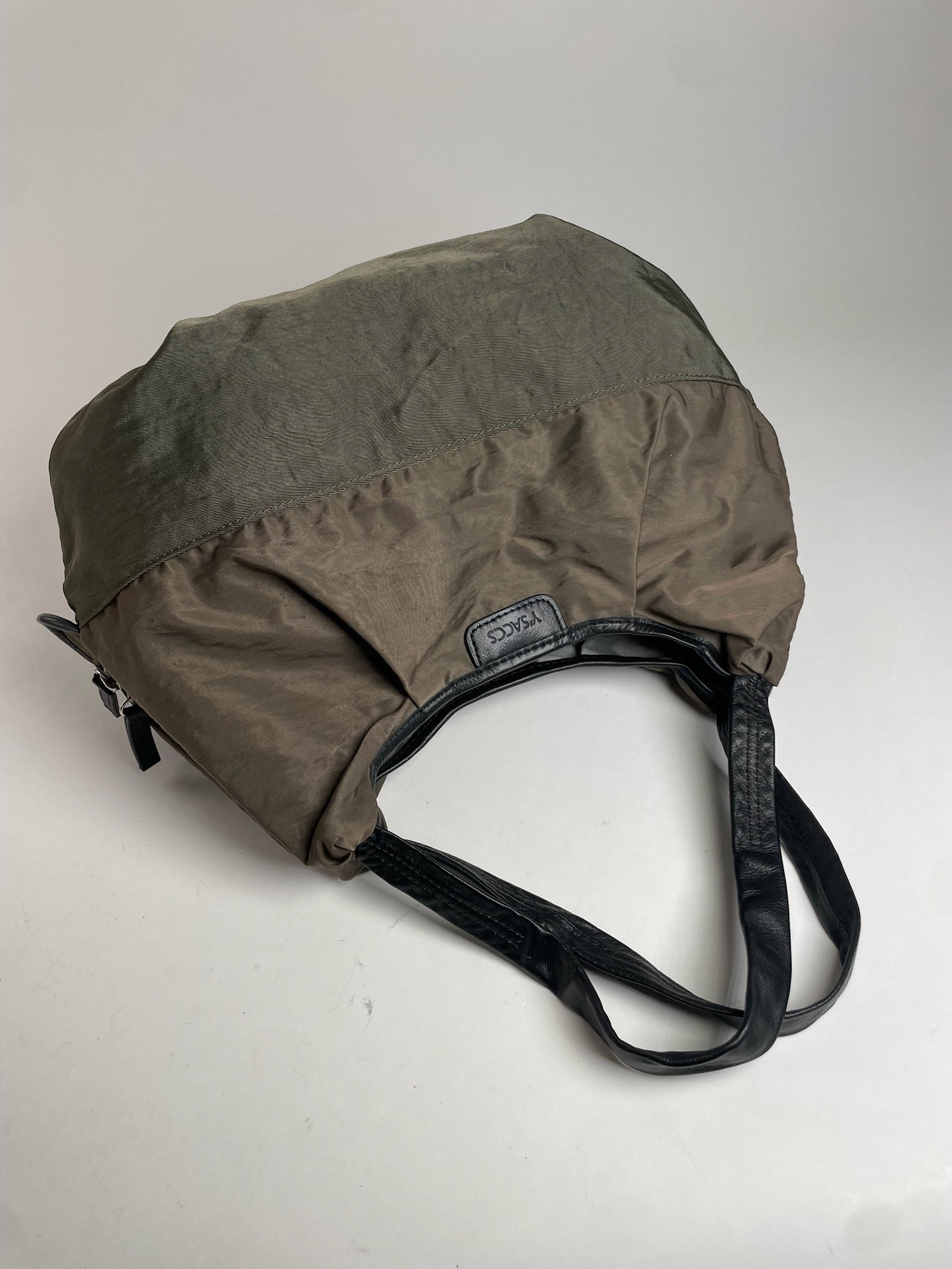 Y-SACCS Vintage Polyester Handbag. This chic handbag is finely crafted of brown-khaki polyester with black leather accents. The bag features silver-tone steel hardware, a top zipper closure, and side attachments to add an optional shoulder strap. The bag opens to a spacious interior lined in silver polyester with interior magnetic closures for easy organization.