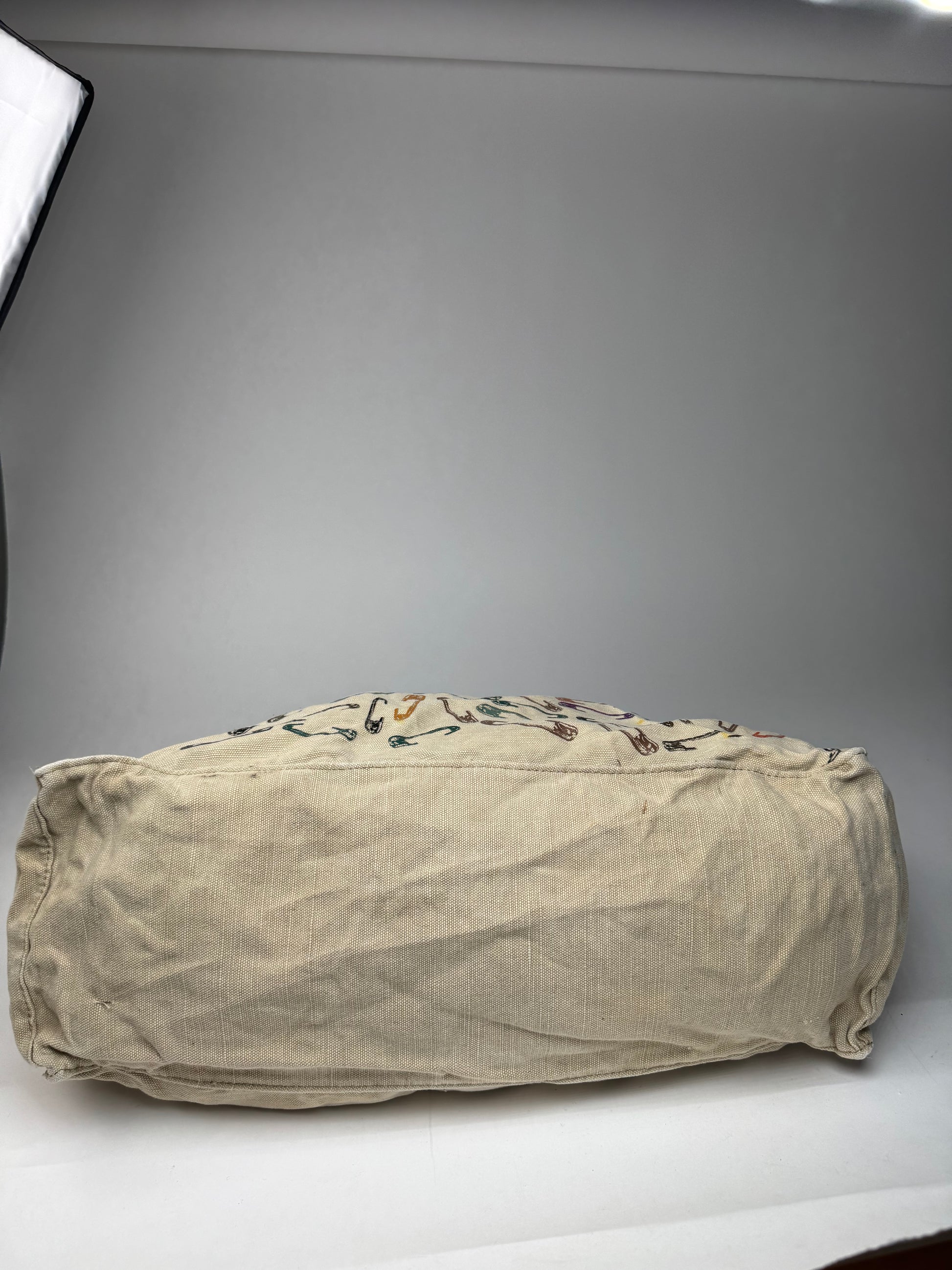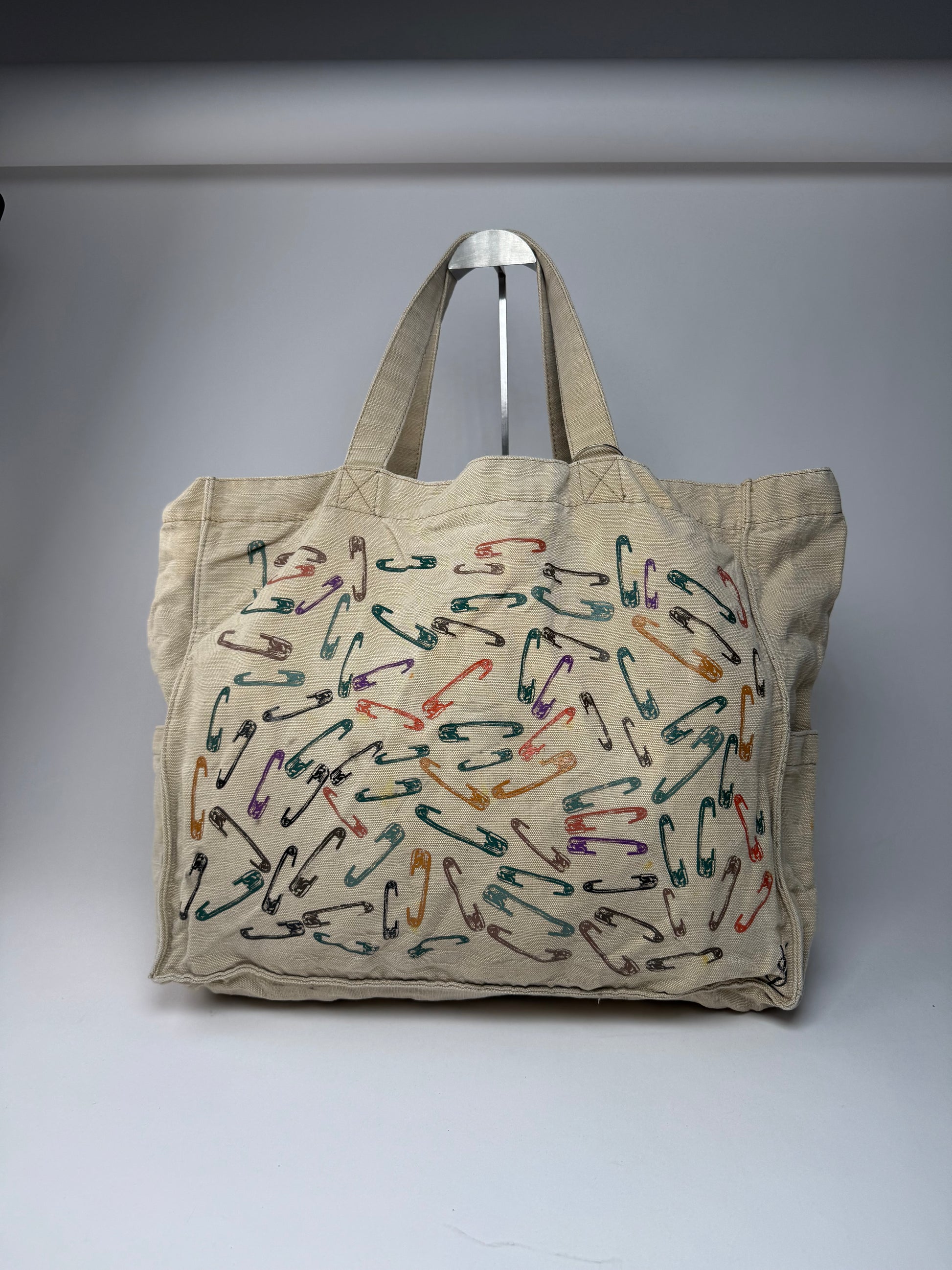 This chic handbag is finely crafted of beige canvas with colorful safety pin motifs on the front.