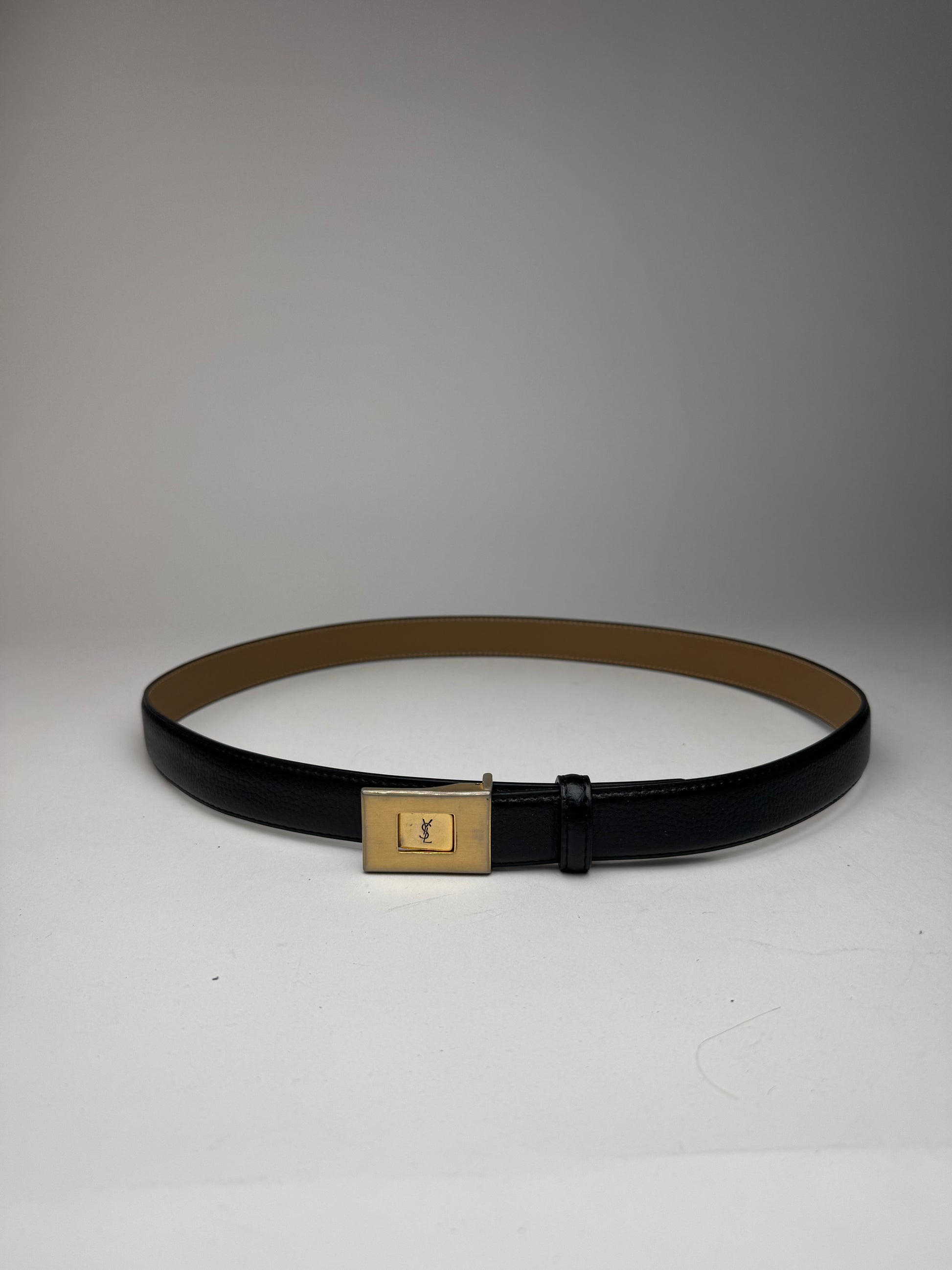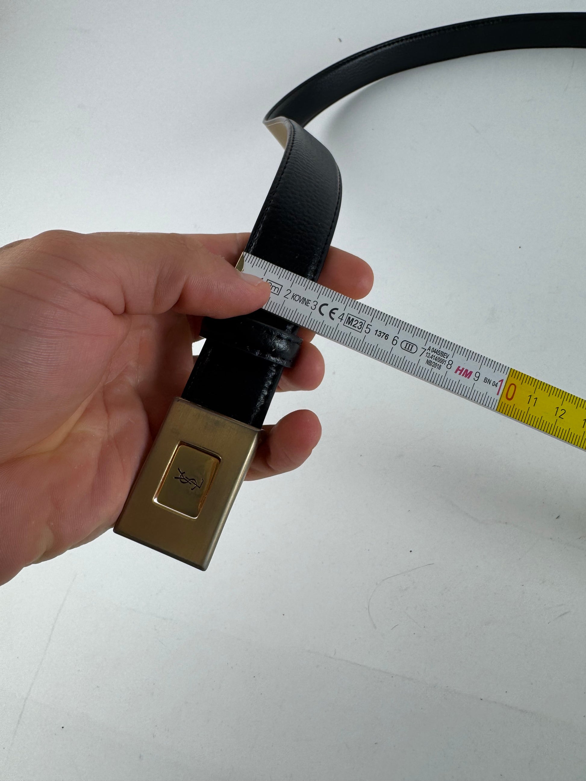 YVES SAINT LAURENT Black Leather Belt. This refined belt features a lightly grained black leather strap and a gold-tone steel buckle with a black Yves Saint Laurent YSL logo at the center. The leather strap is a replacement and not original. The belt holes still need to be punched.