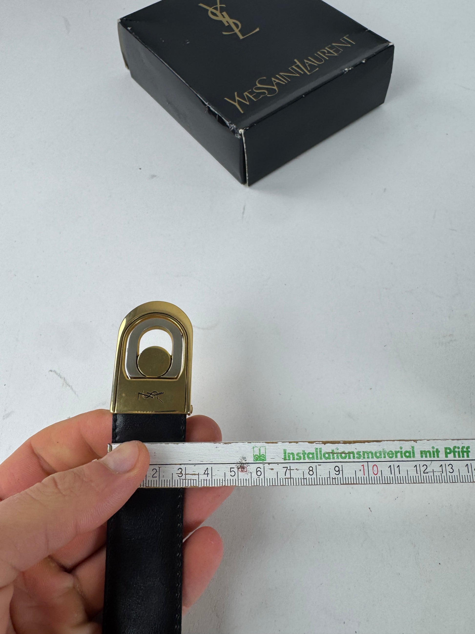 This refined vintage belt is crafted from smooth black leather and features a distinctive buckle in mixed silver- and gold-tone steel, finished with a black YSL logo. Likely dating to the 1980s, this piece reflects Yves Saint Laurent’s iconic blend of elegance and bold, graphic design. Designed for unisex wear, it is a timeless accessory with classic appeal.