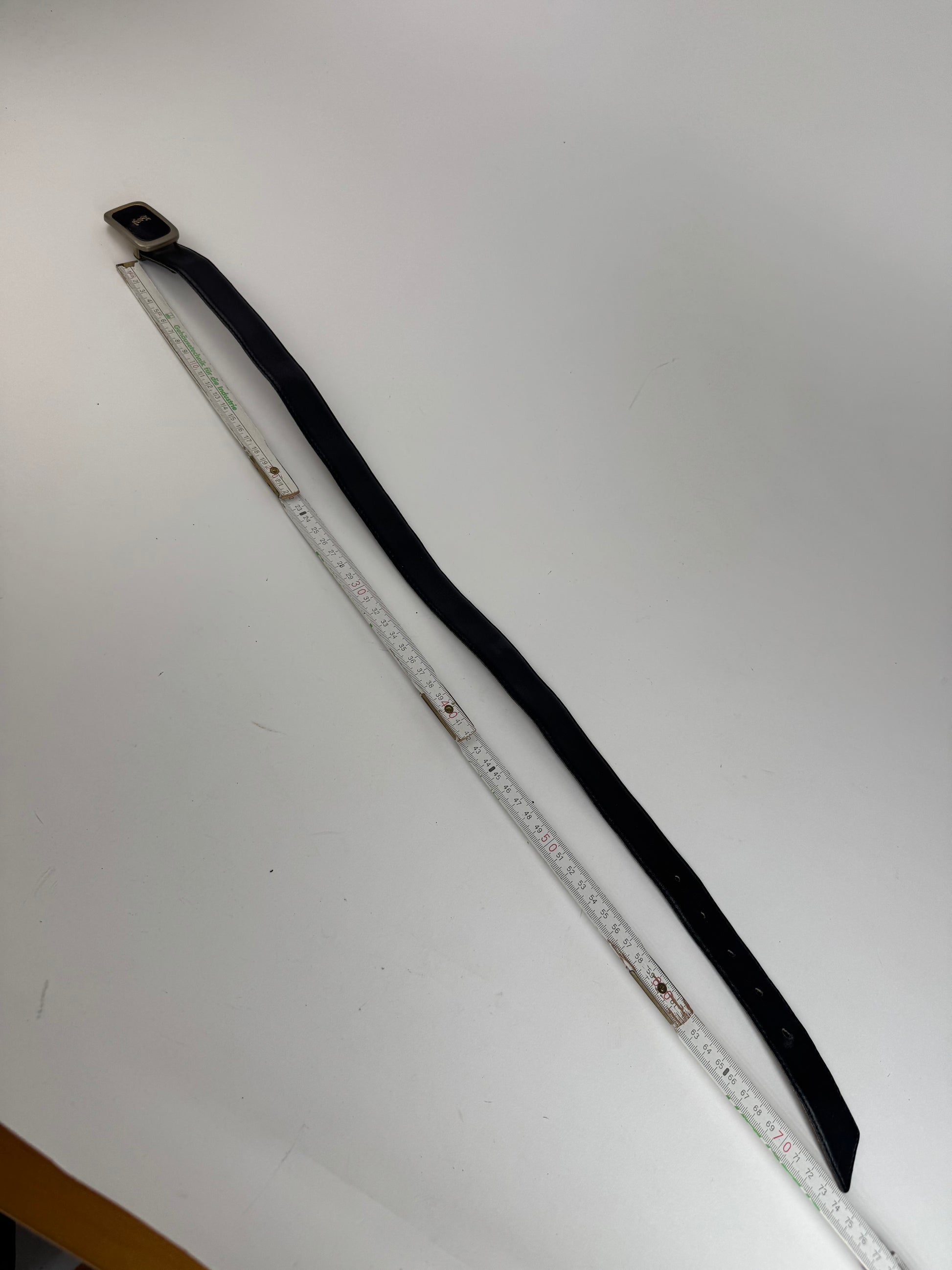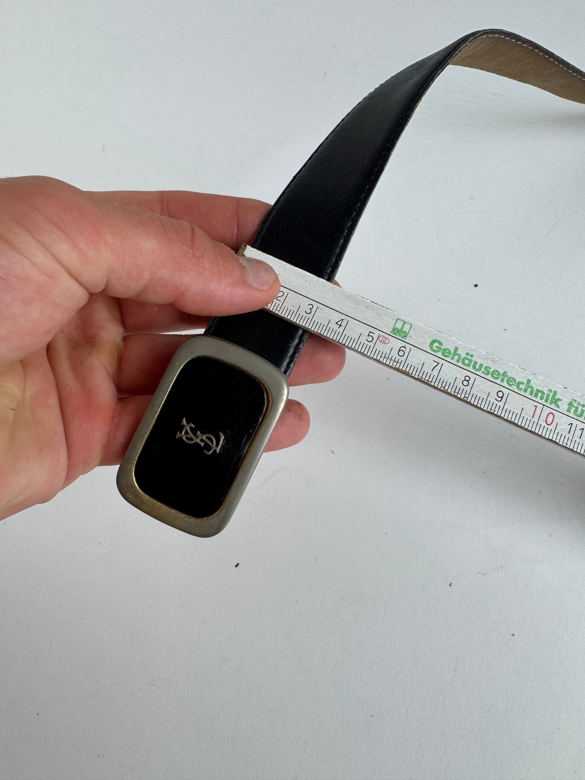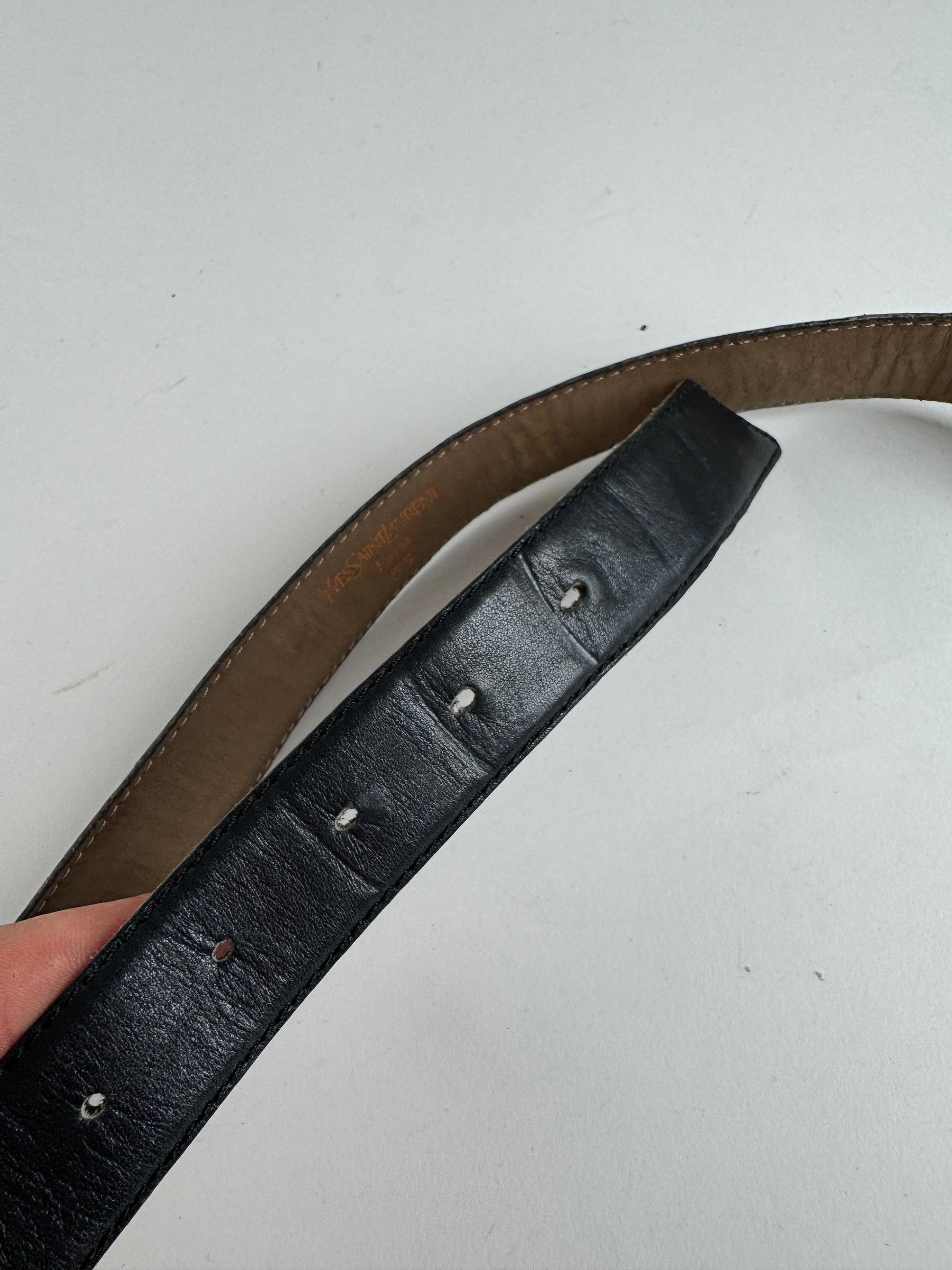 YVES SAINT LAURENT Vintage Leather Belt. This vintage belt is finely crafted of black leather with a silver-tone steel buckle, black-coated and featuring the YSL logo. The interior is finished in brown leather.