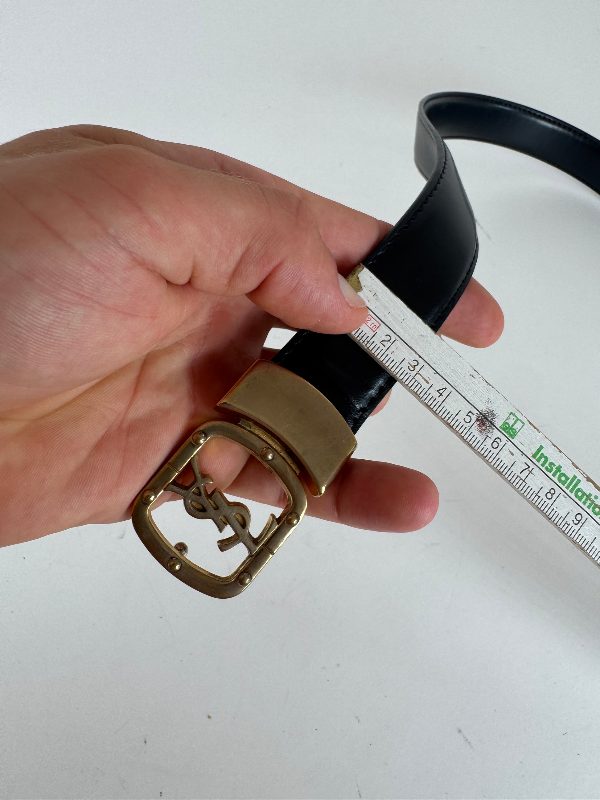 YVES SAINT LAURENT Black Leather Belt with Gold YSL Logo Buckle.