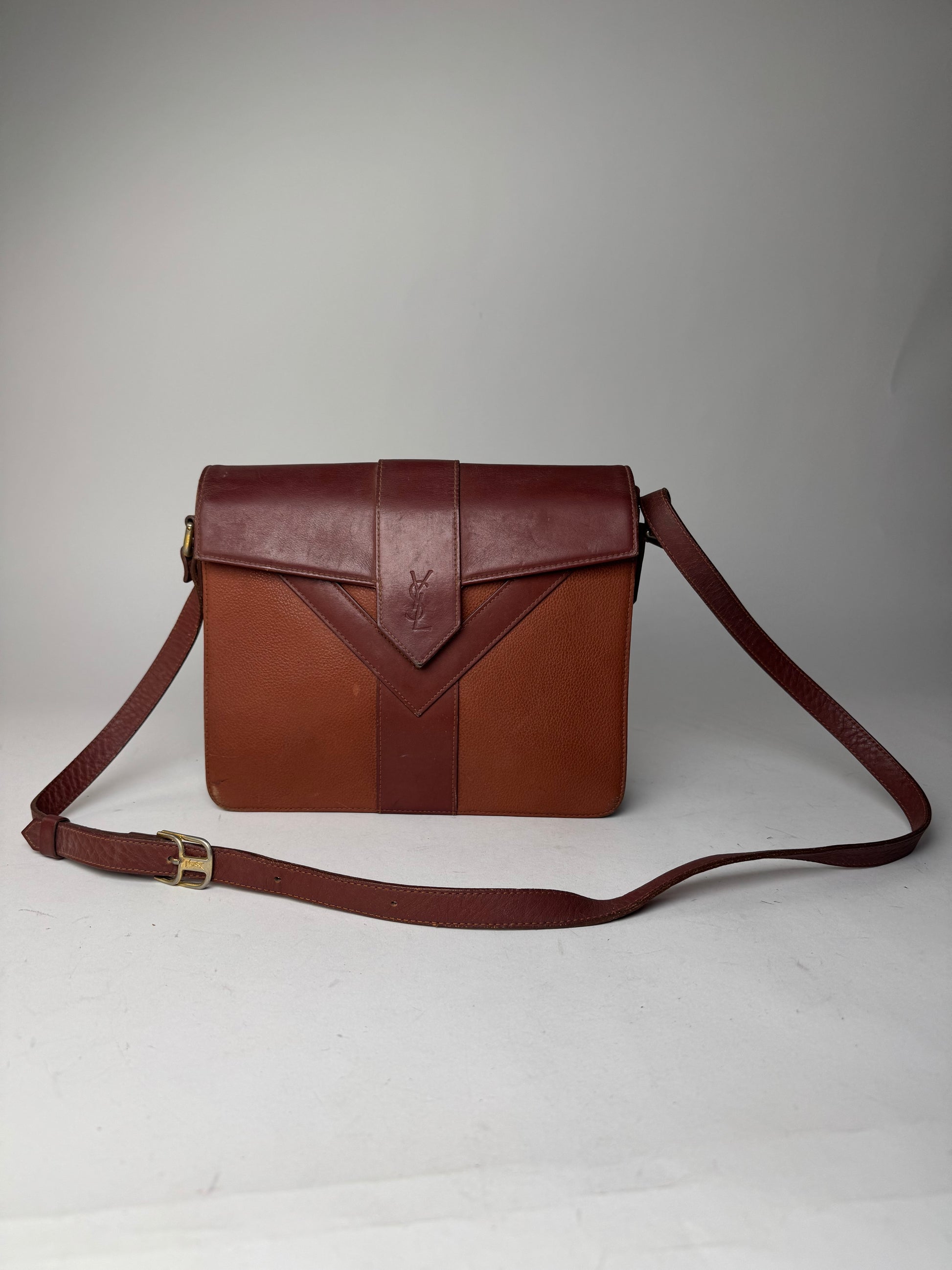 YVES SAINT LAURENT Vintage Shoulder Bag. This elegant vintage shoulder bag is crafted of orange-brown leather combined with rich red-brown leather accents, creating a warm and timeless colour contrast. The adjustable shoulder strap allows for versatile wear as a crossbody or shoulder bag. The bag is secured with a magnetic closure and finished with gold-tone steel hardware that has developed a slightly faded vintage patina.