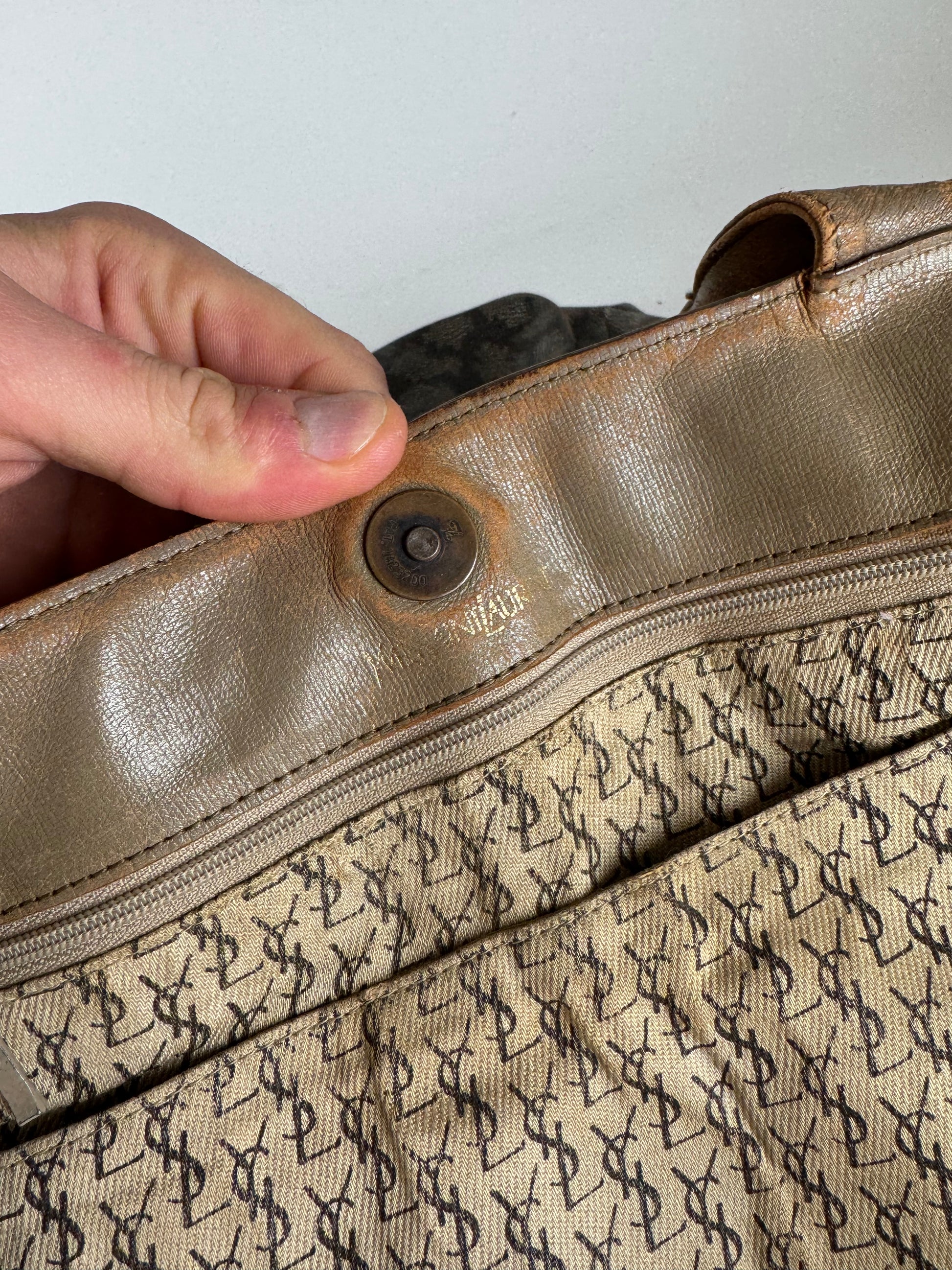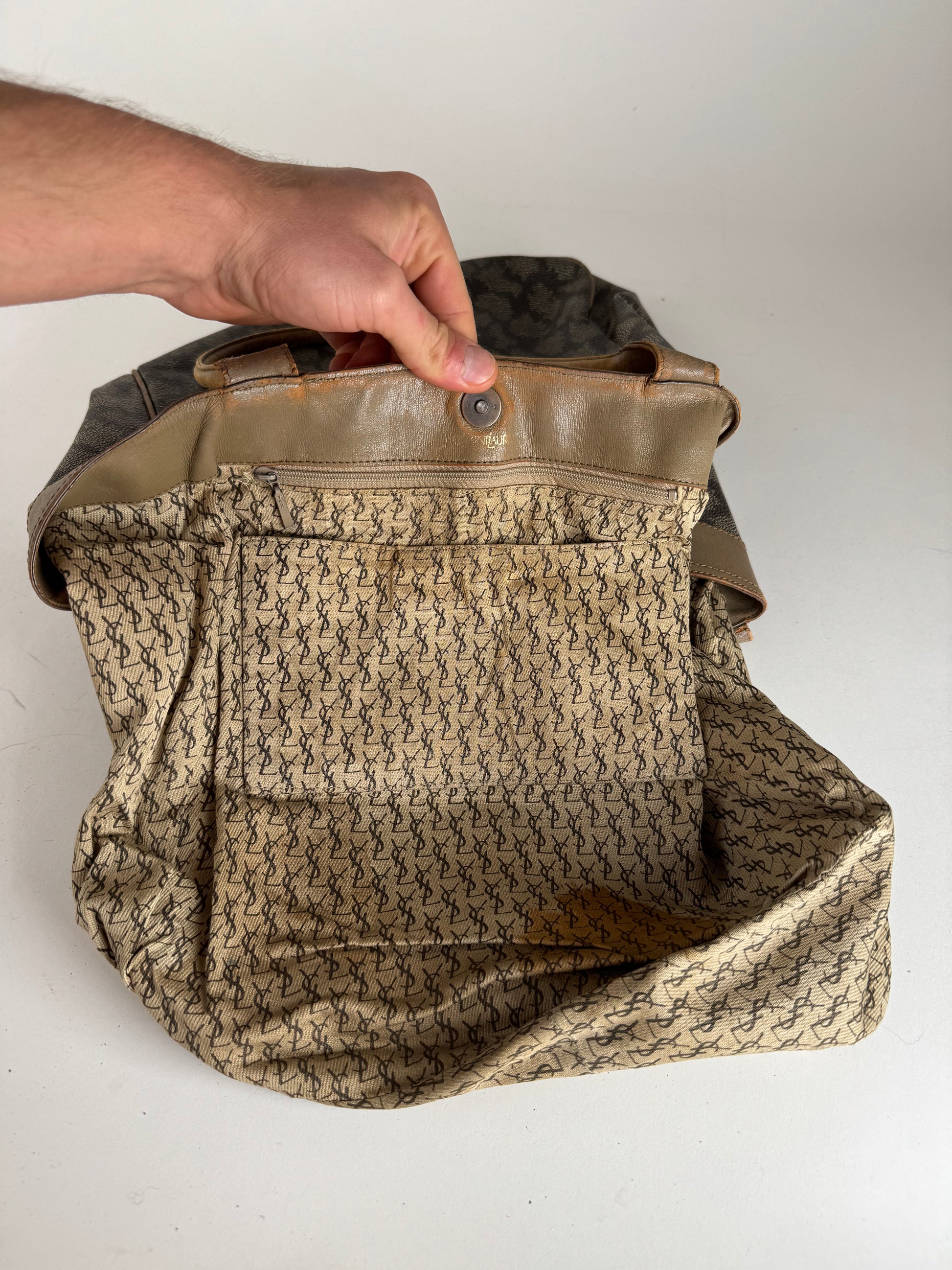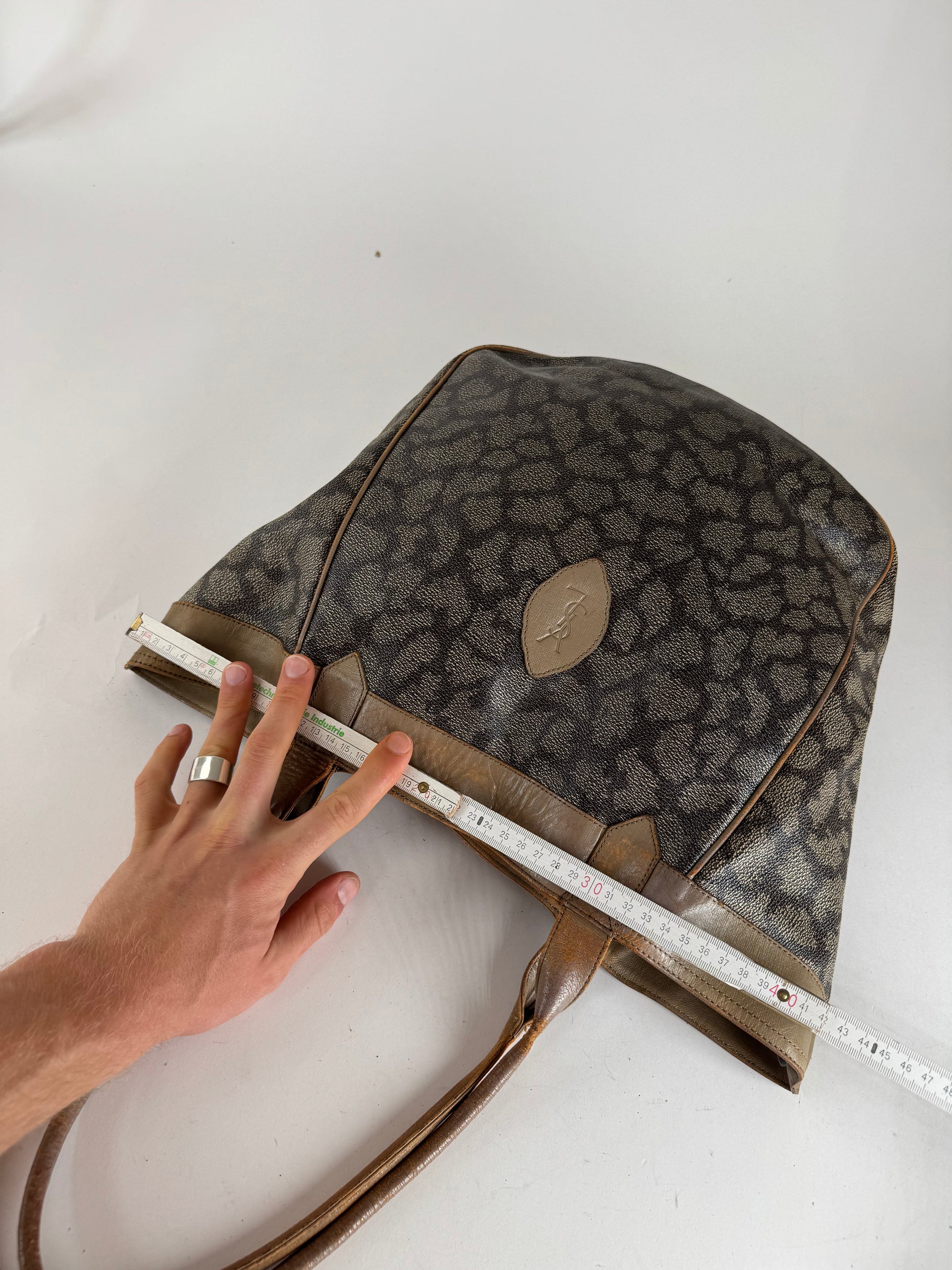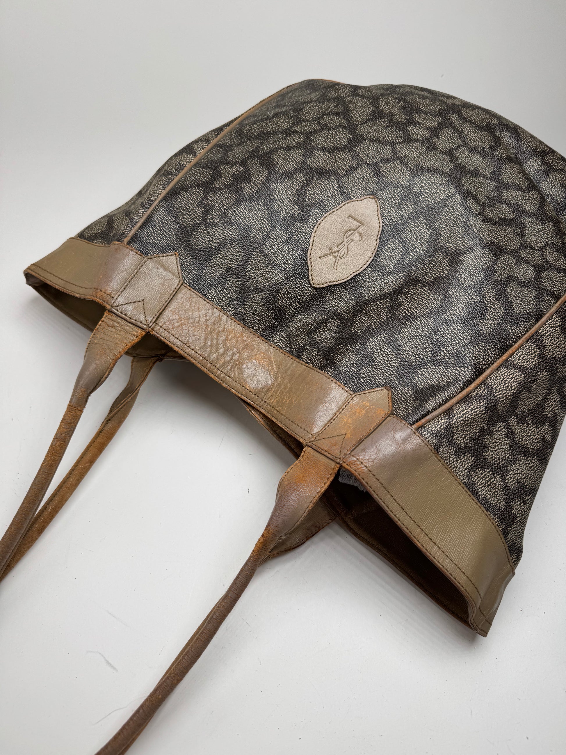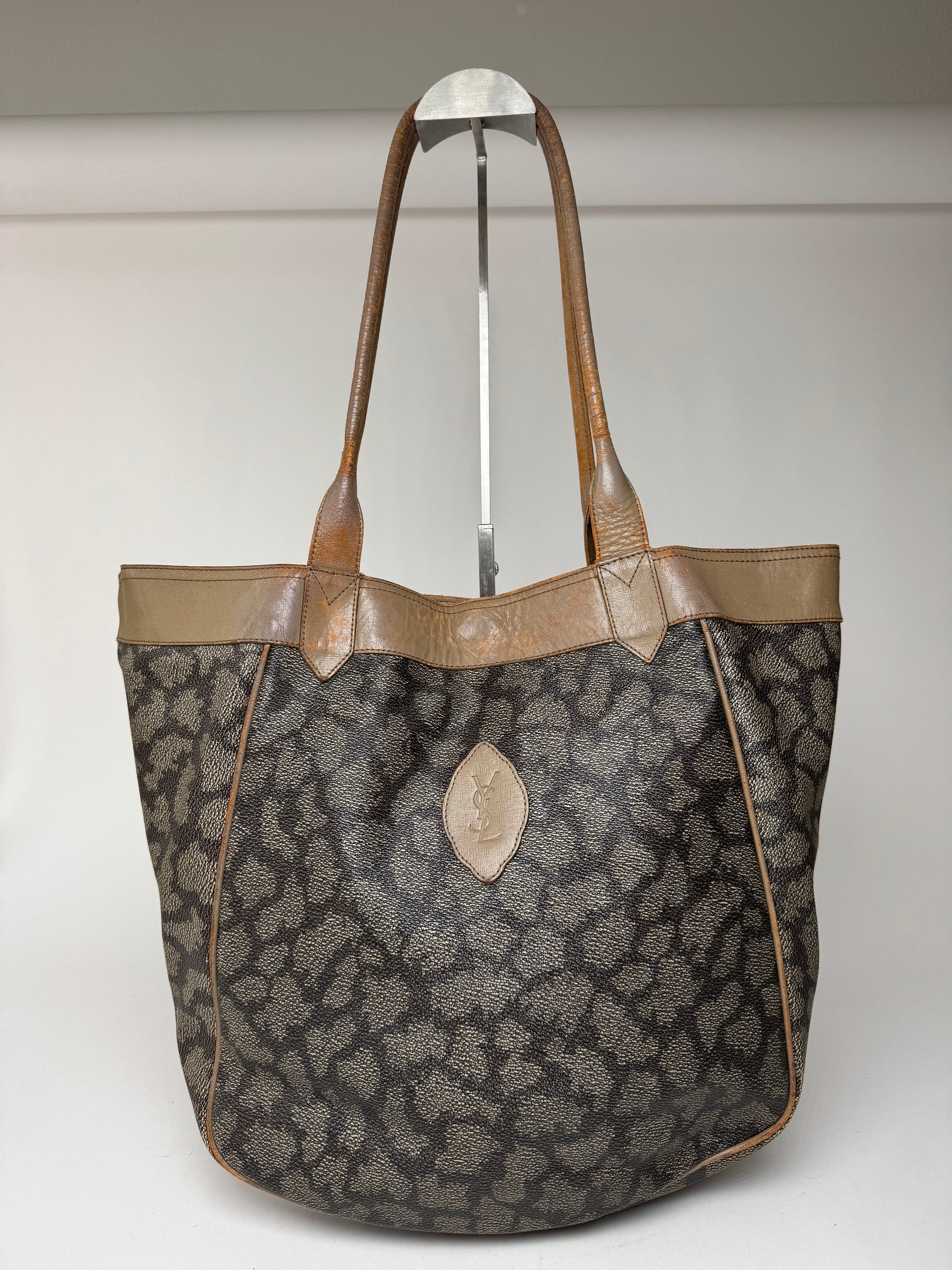 YVES SAINT LAURENT Vintage 2-Way Shopper Bag. This stylish shopper is finely crafted of stone grey and black patterned leather with long brown leather handles. The bag can be worn in two different ways and features a gold-brown YSL monogram canvas interior.