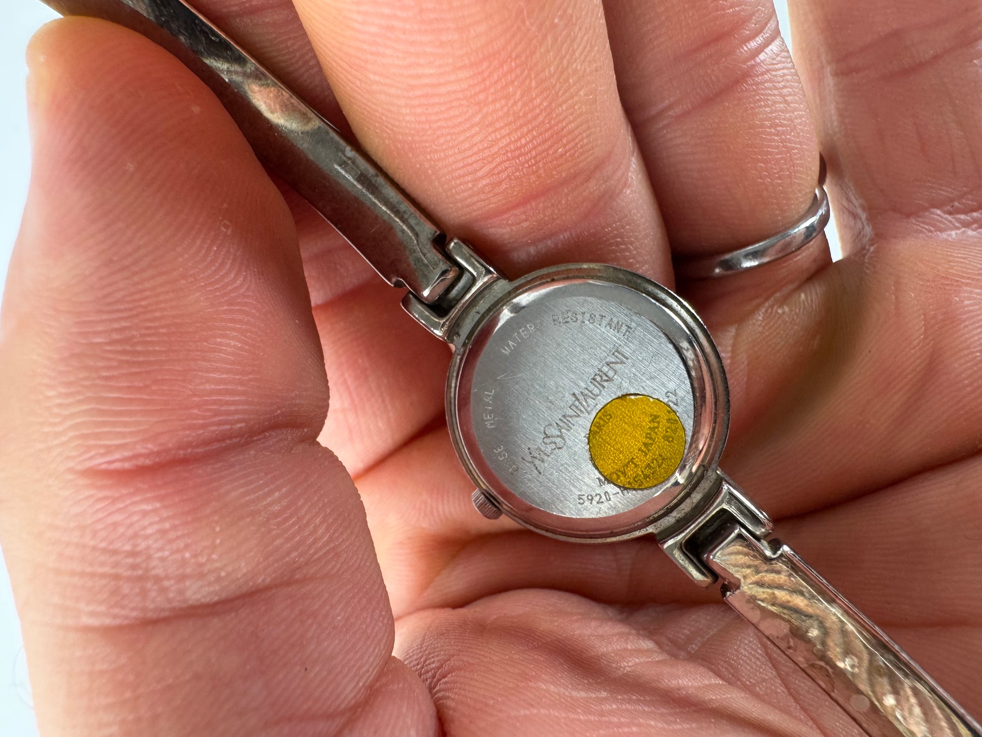 YVES SAINT LAURENT Vintage Watch. This striking vintage wristwatch features a bold blue dial with an oversized YSL logo, creating a distinctive statement design. The bracelet is crafted of silver-tone stainless steel, complemented by silver-tone steel hands for a clean and modern contrast. The watch is quartz operated, and the battery has been recently replaced.