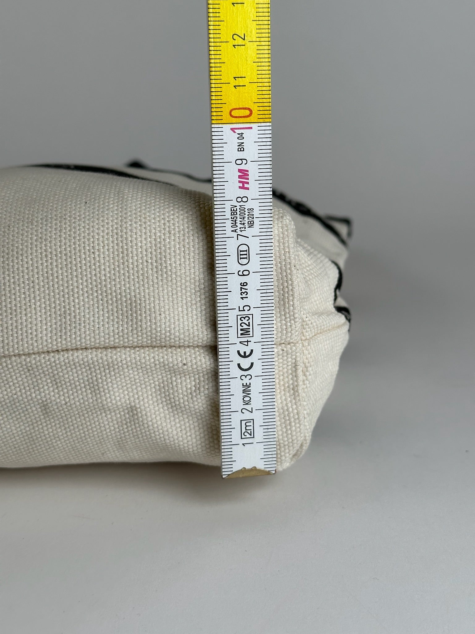 YVES SAINT LAURENT White Canvas Vintage Shopper. This stylish shopper is finely crafted of white canvas featuring black Yves Saint Laurent lettering. The bag includes black canvas handles and opens to a spacious interior.