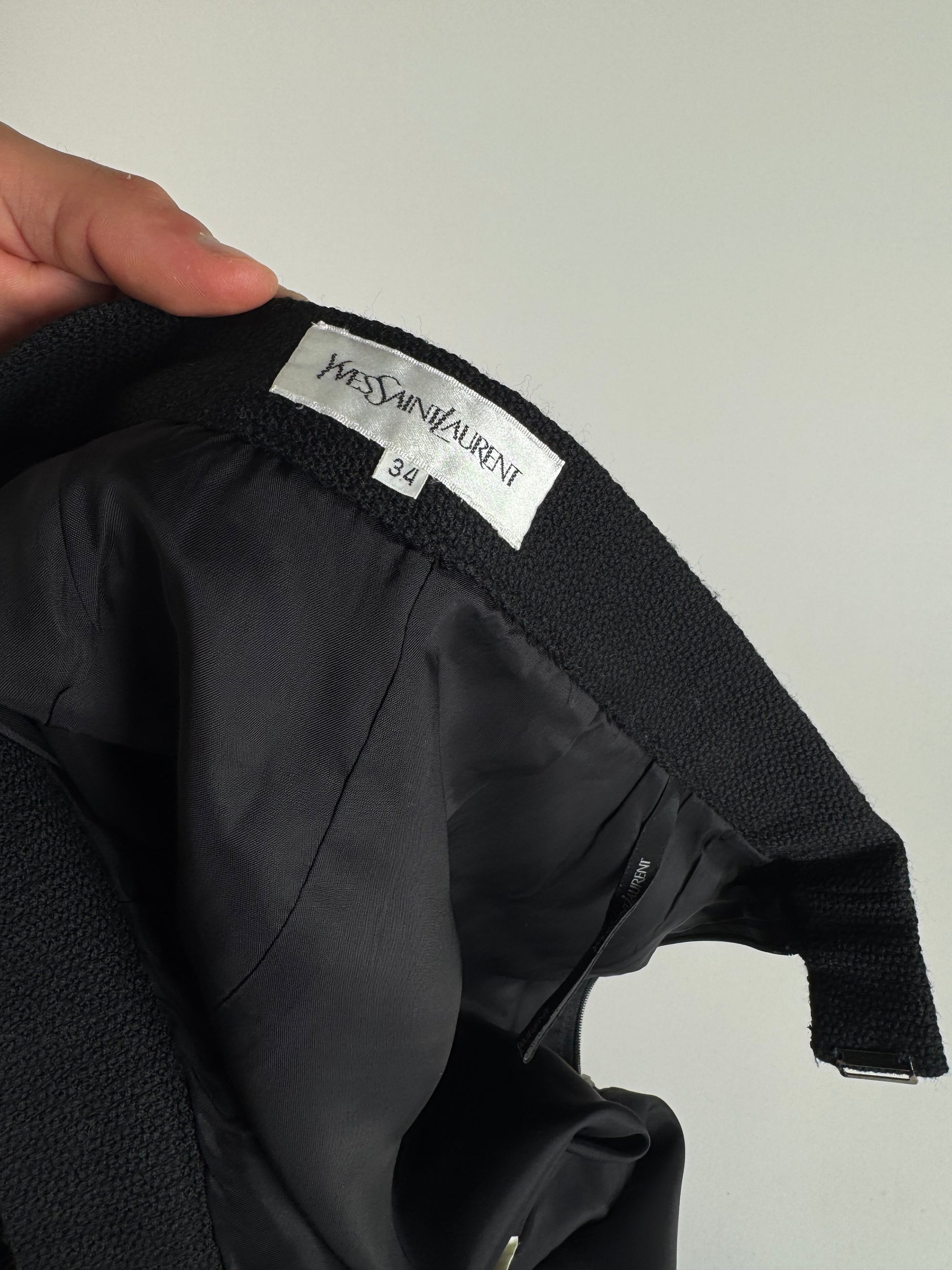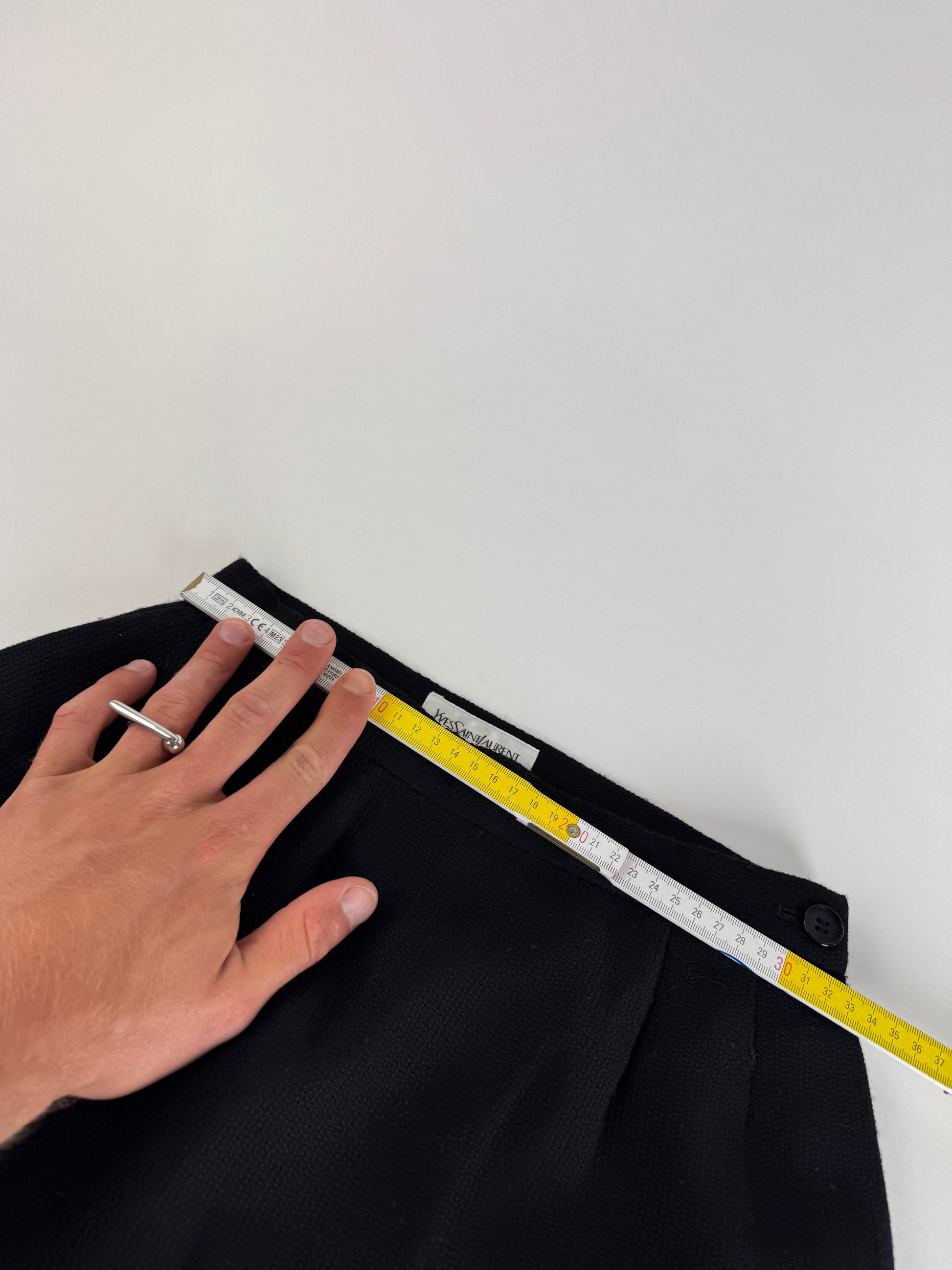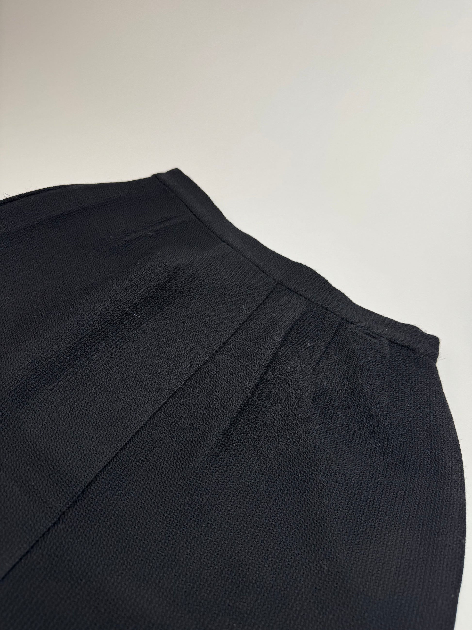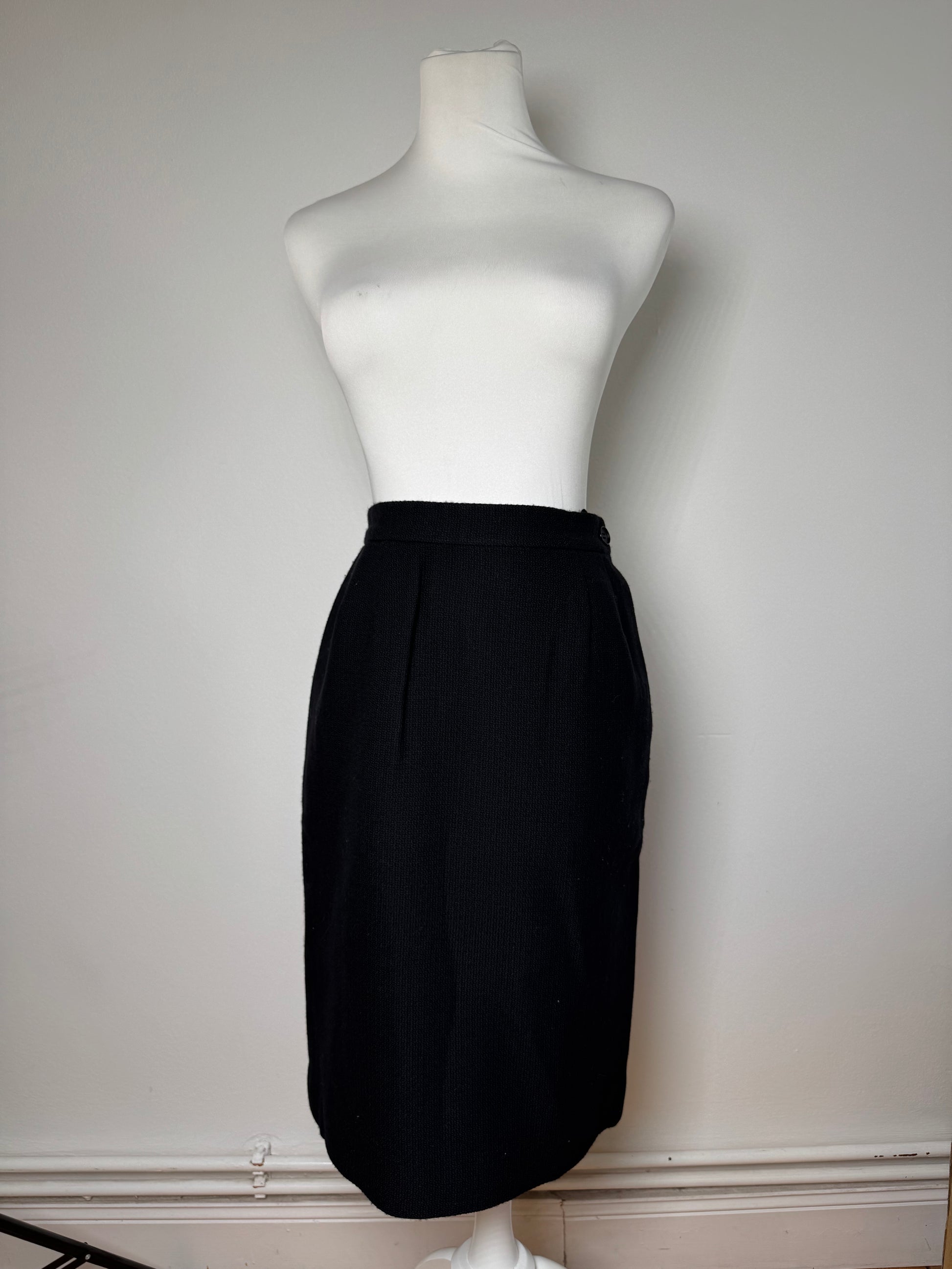 This chic skirt is finely crafted of black wool with a black plastic button and viscose lining.