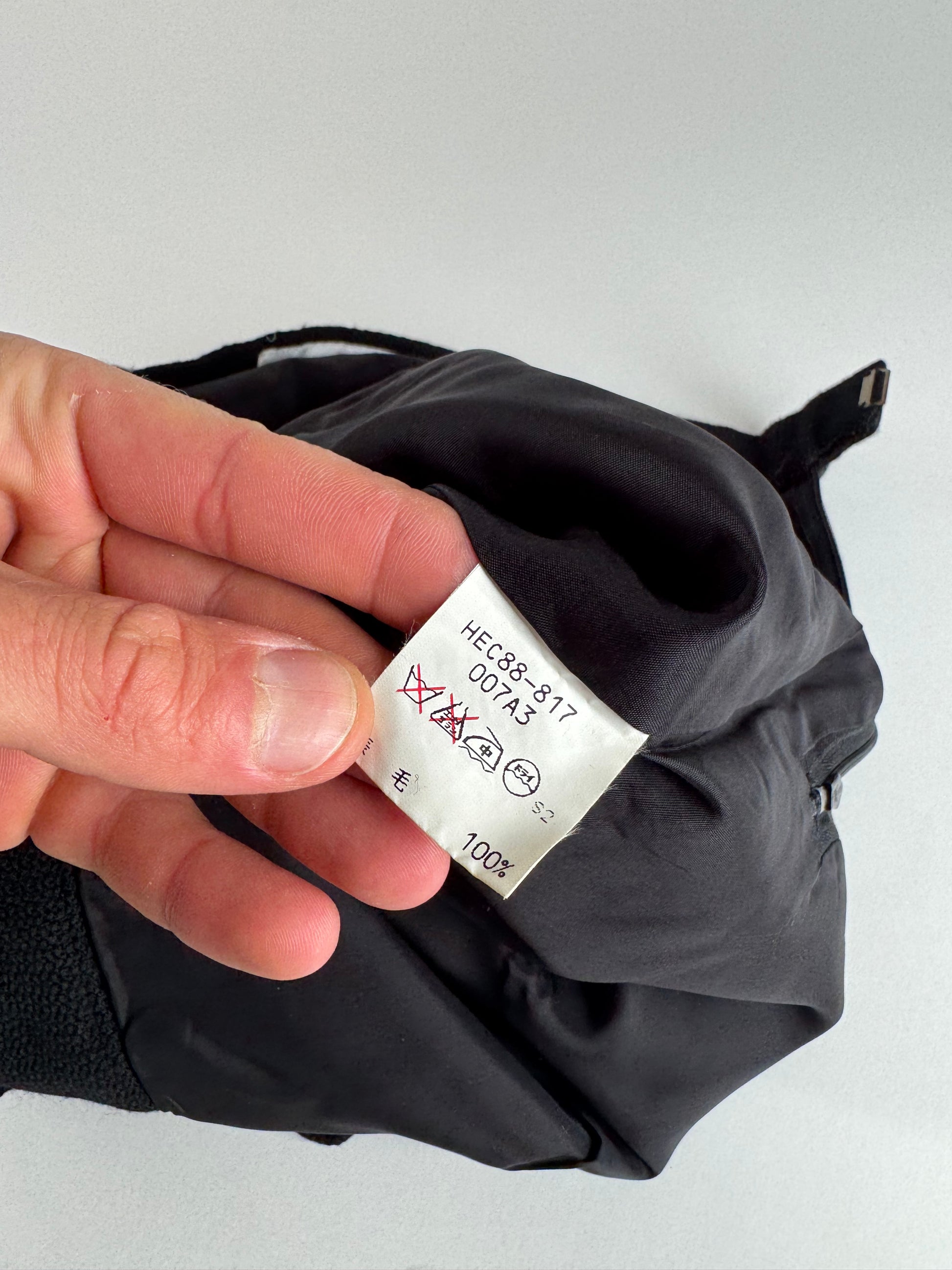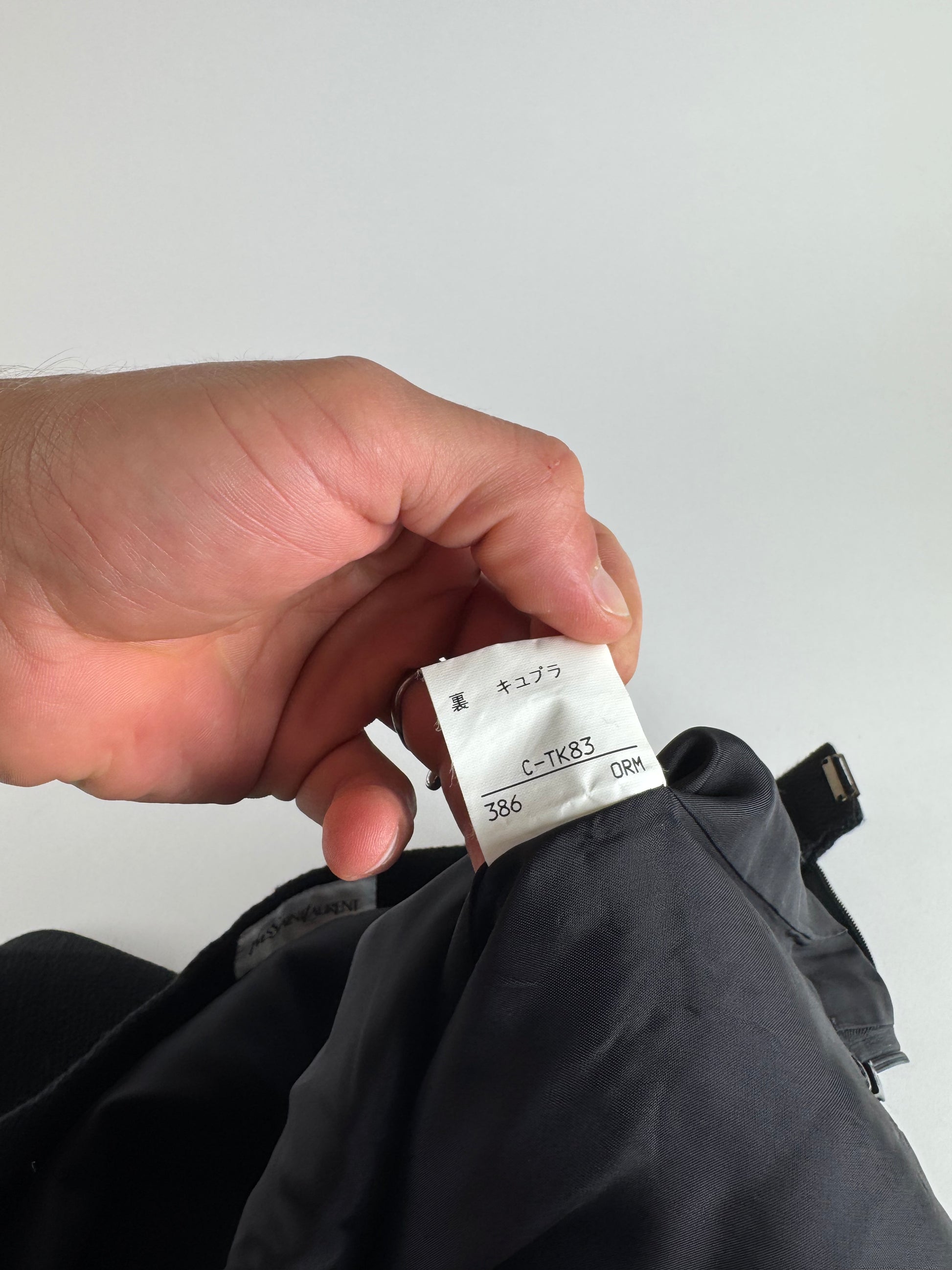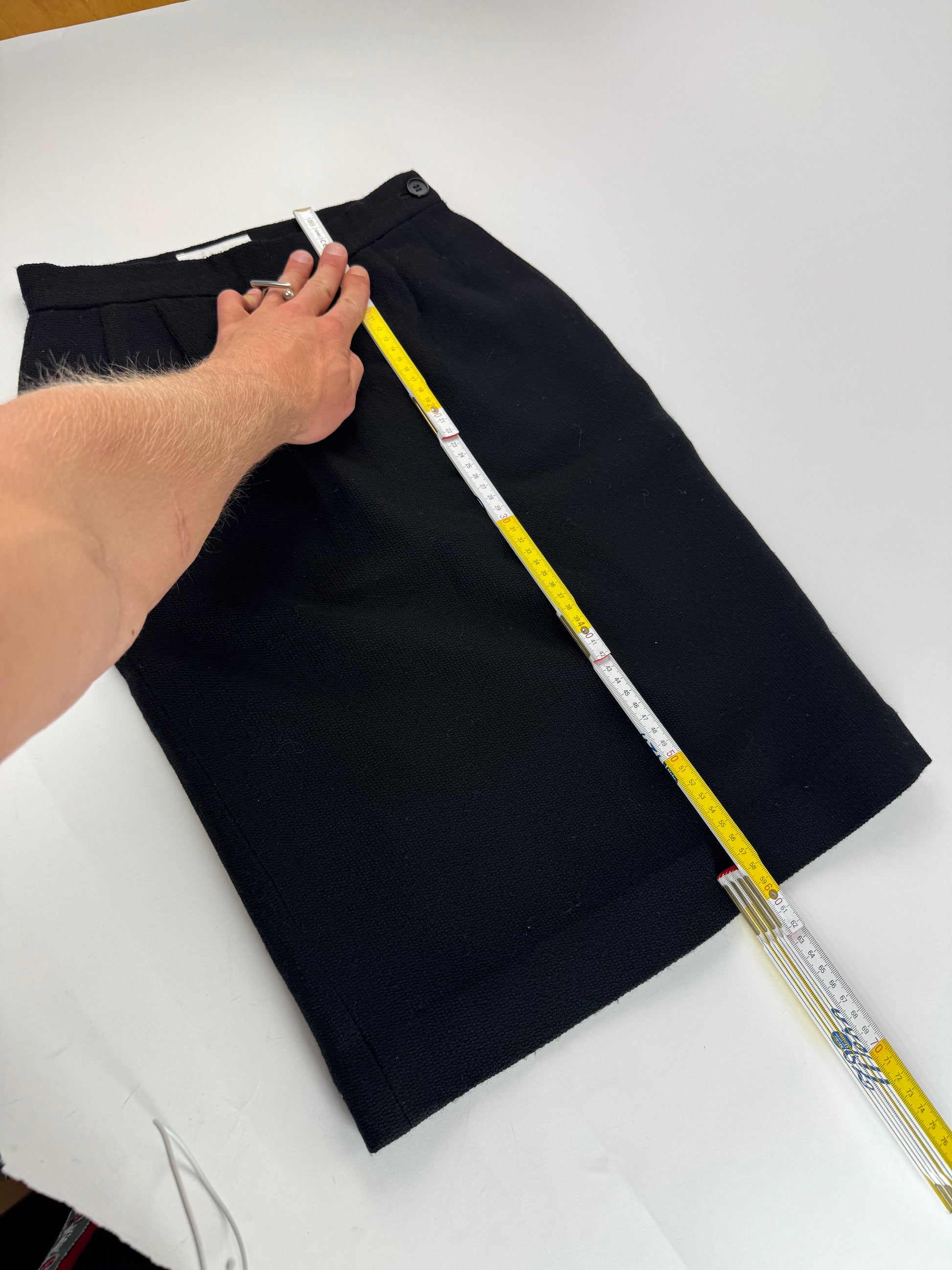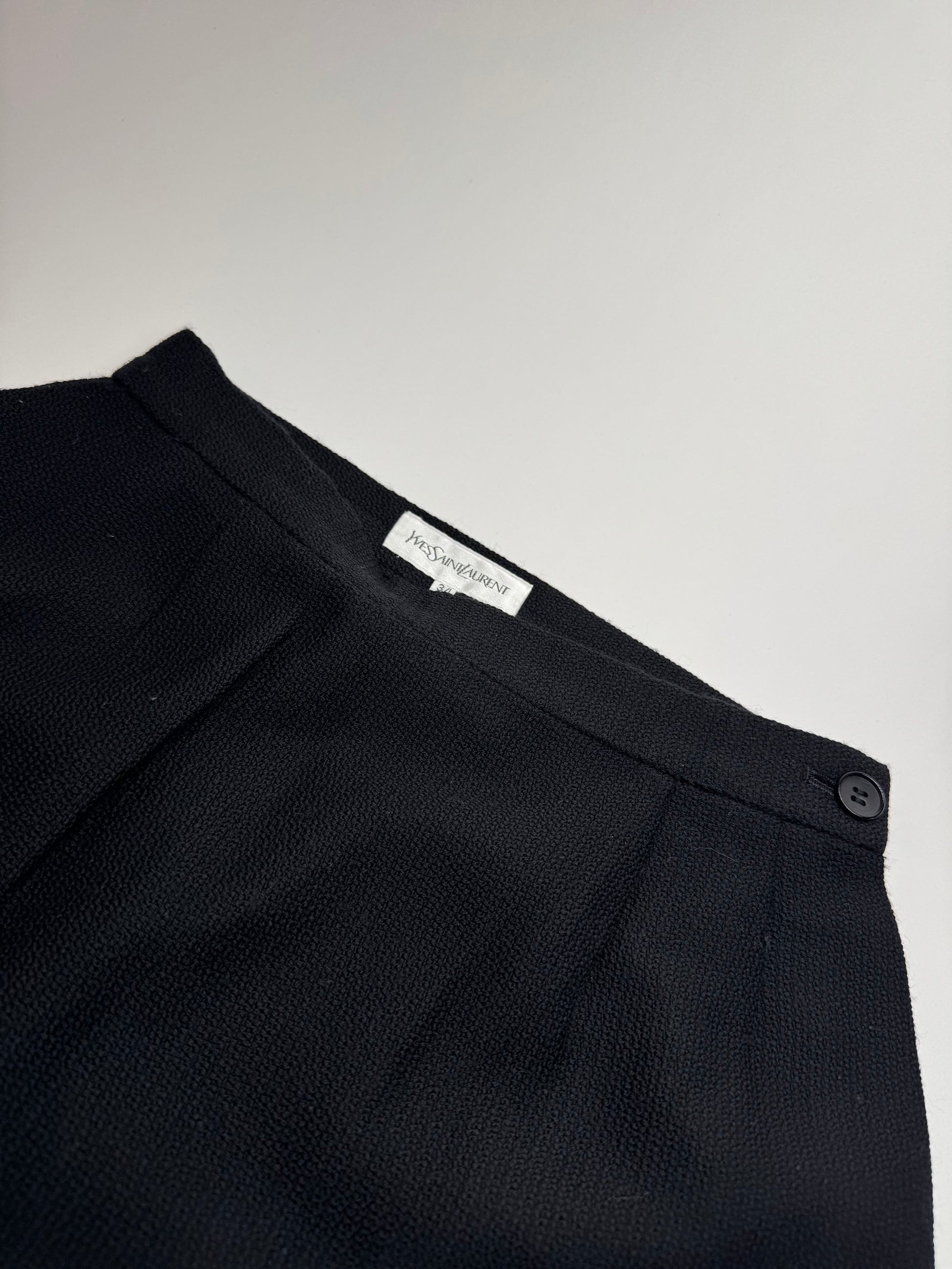 This chic skirt is finely crafted of black wool with a black plastic button and viscose lining.