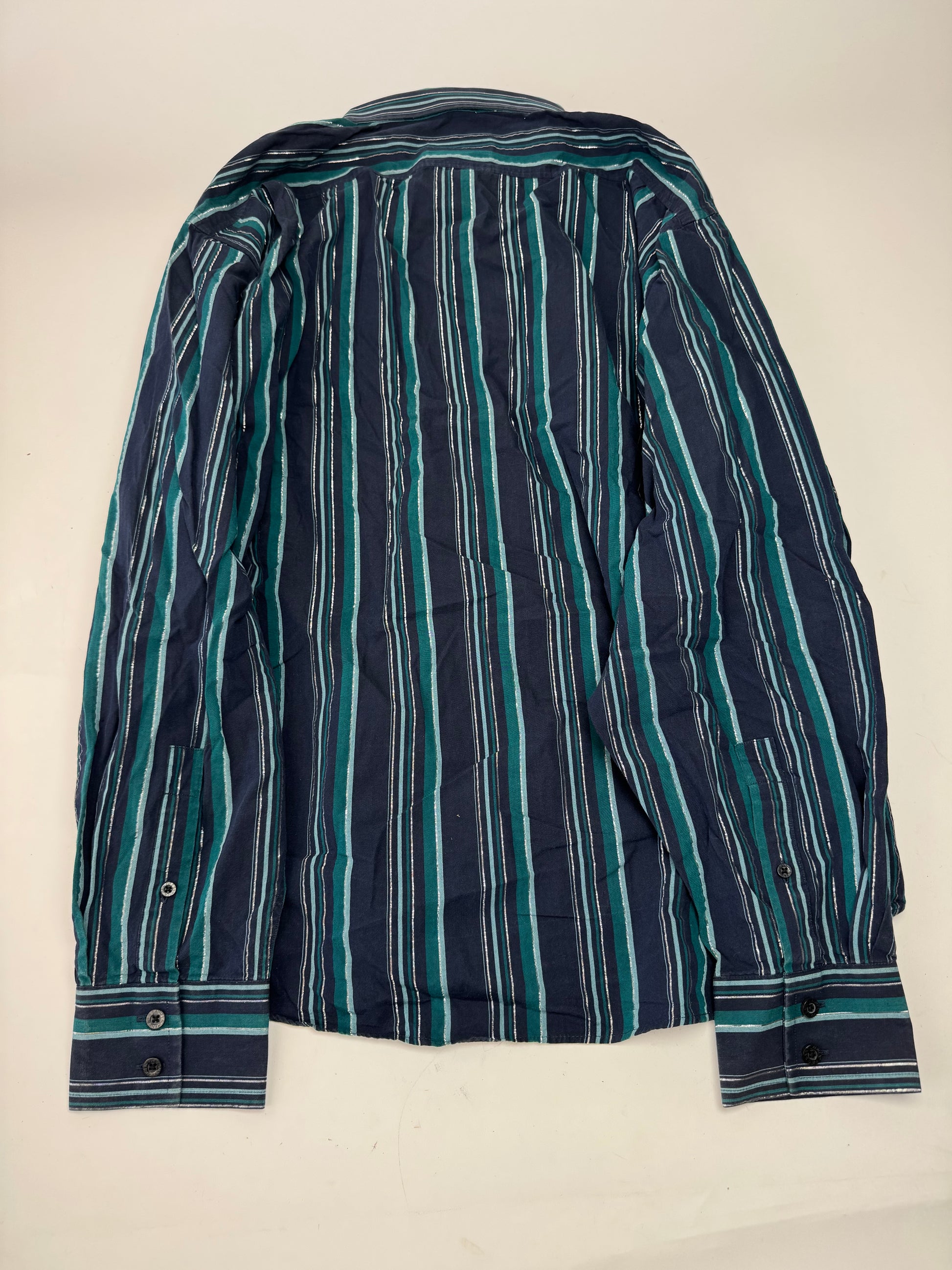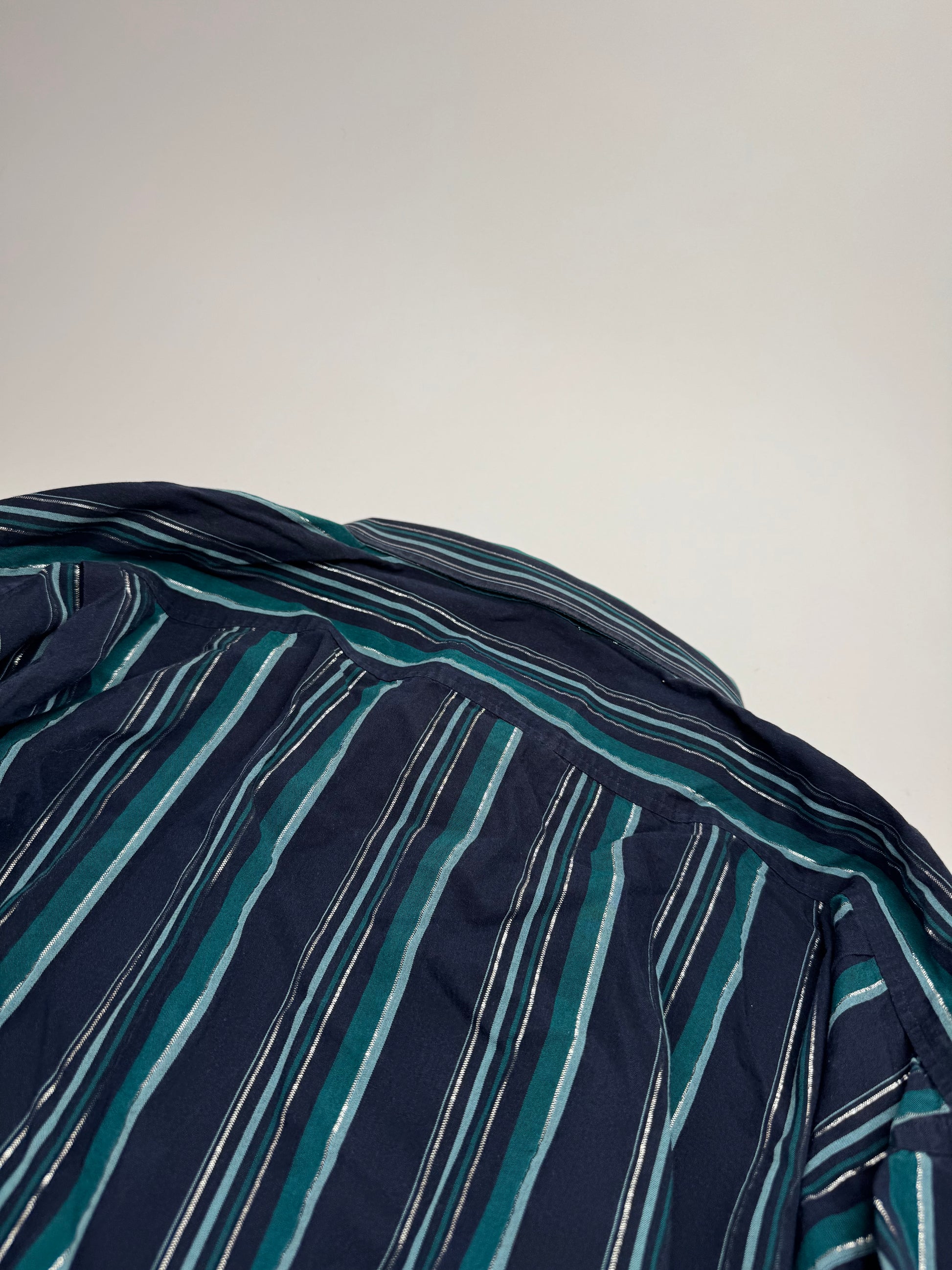 This stylish vintage shirt by Yves Saint Laurent features a striking blue, green, and silver striped pattern. Made from 100% cotton, it offers both comfort and a timeless design. The shirt is in size XXL and shows normal signs of wear but remains in great condition.