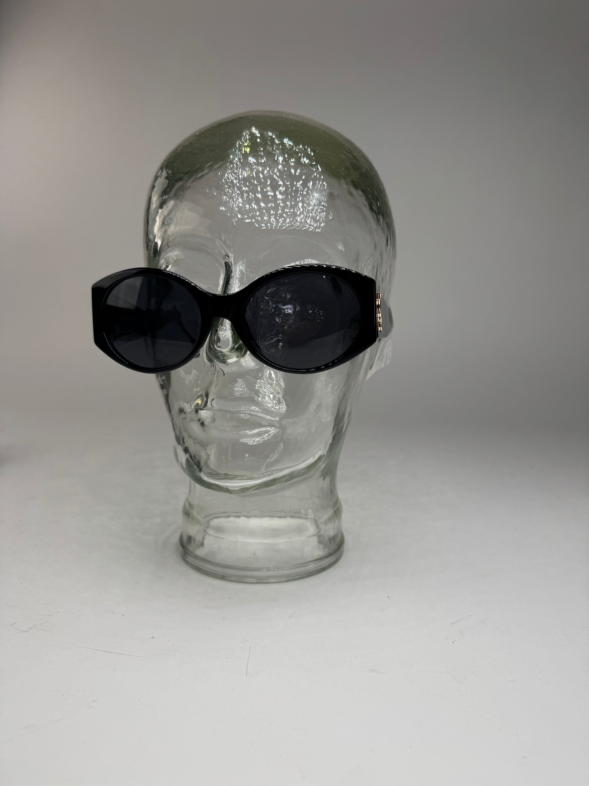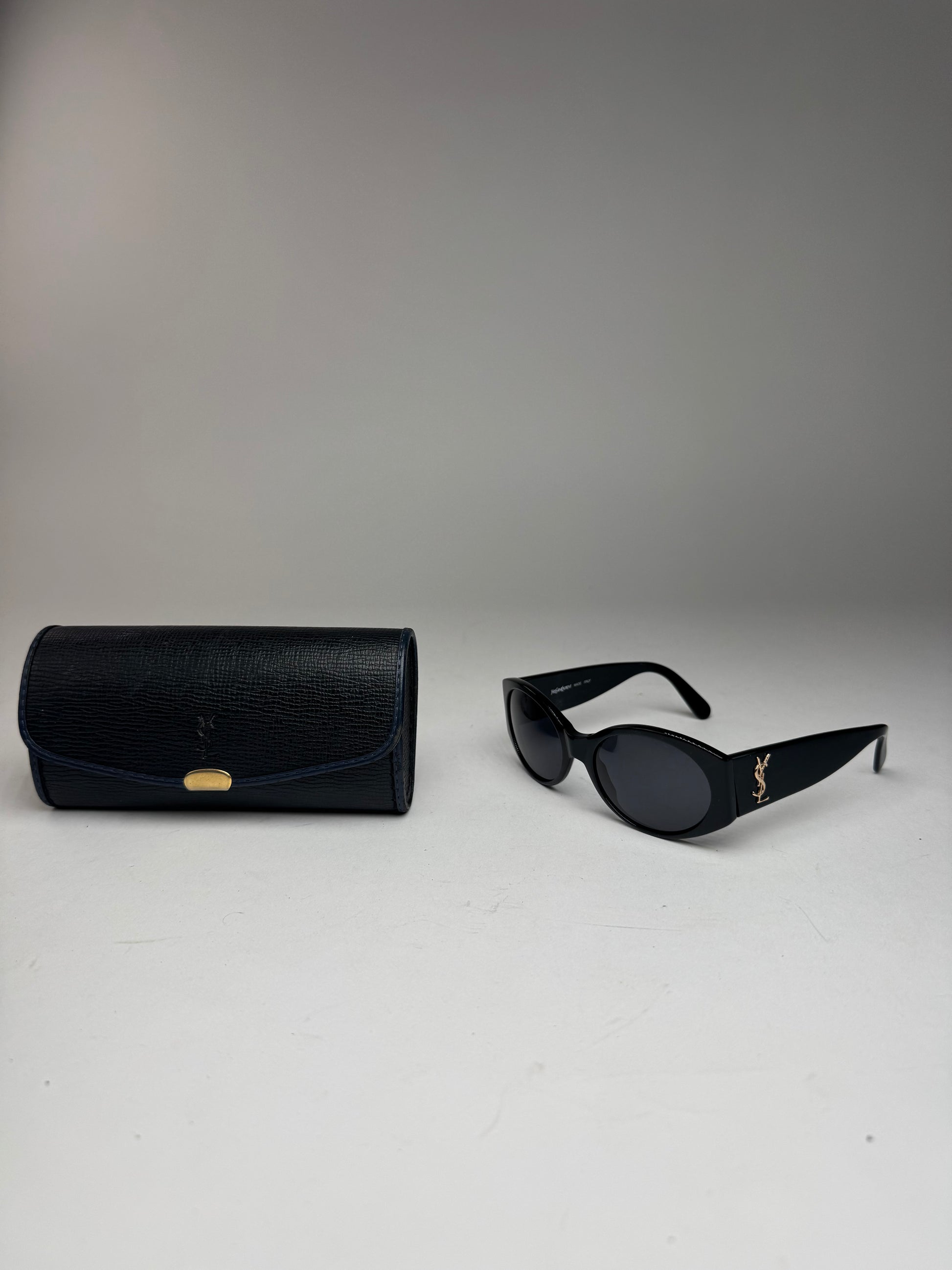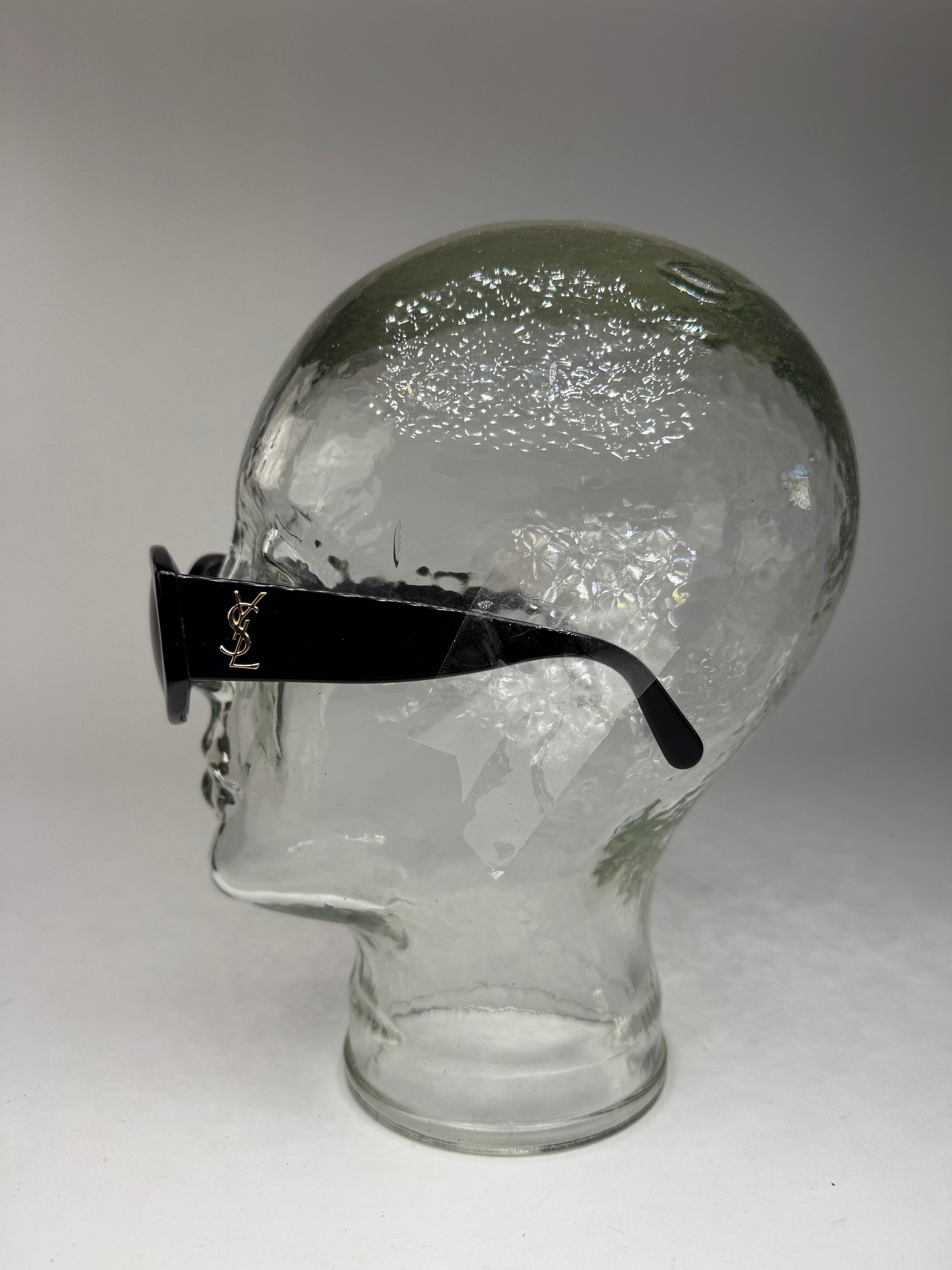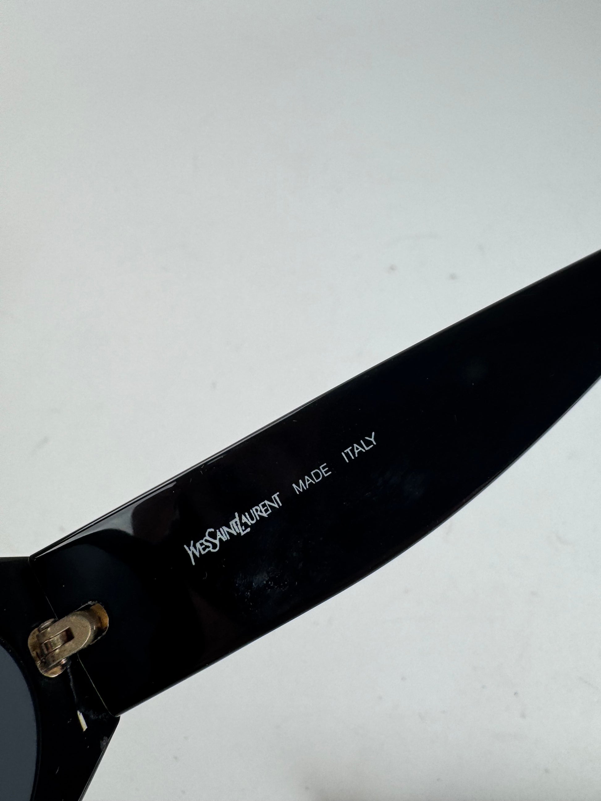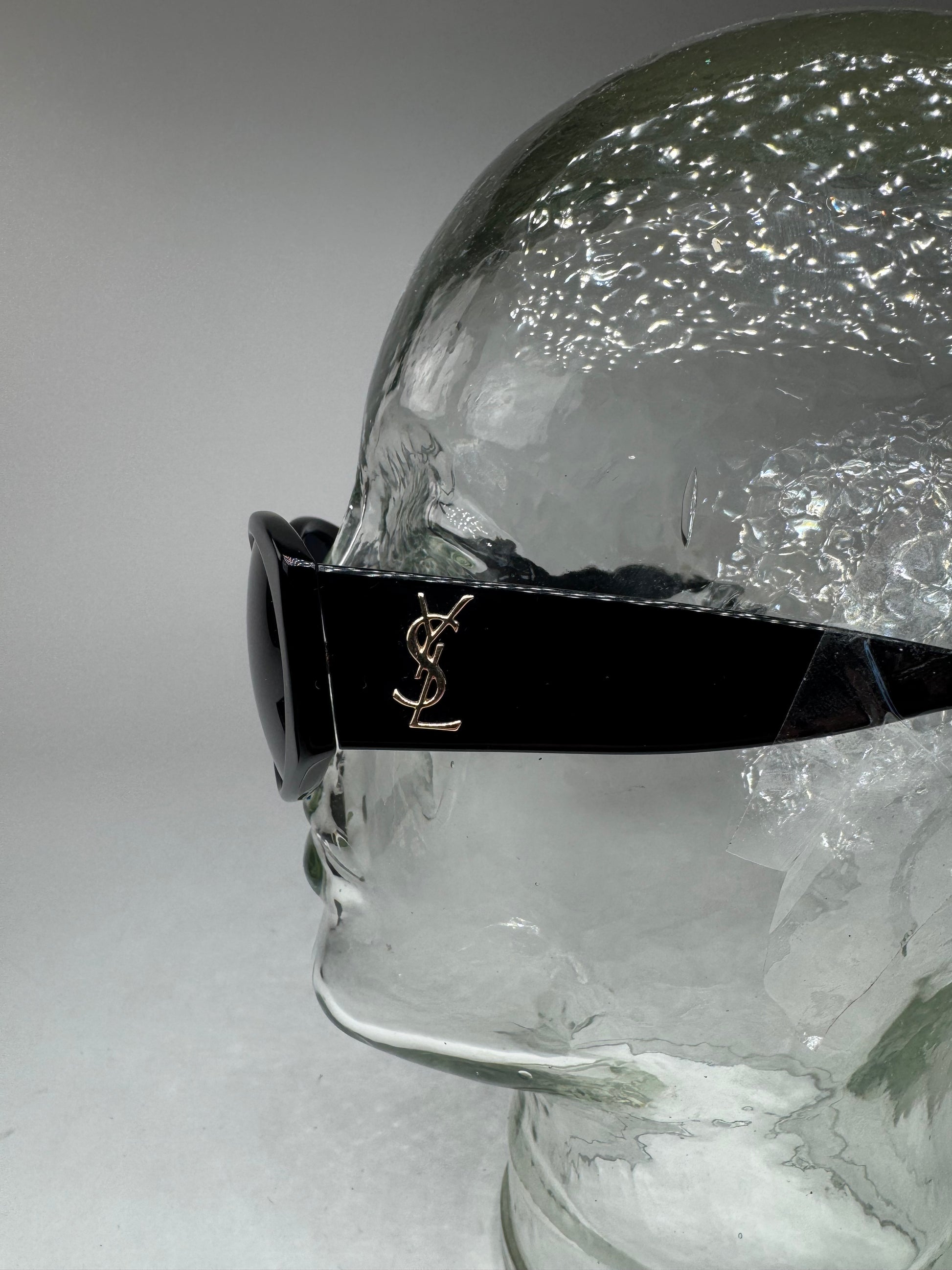 YVES SAINT LAURENT Vintage Logo Sunglasses. These unisex sunglasses are crafted of black acetate and feature dark-tinted lenses. A gold-tone steel YSL logo appliqué adorns the left temple. The iconic YSL monogram, designed in 1961 by French graphic artist Cassandre, became a symbol of modern elegance and the revolutionary spirit of the house of Yves Saint Laurent. Made in Italy.