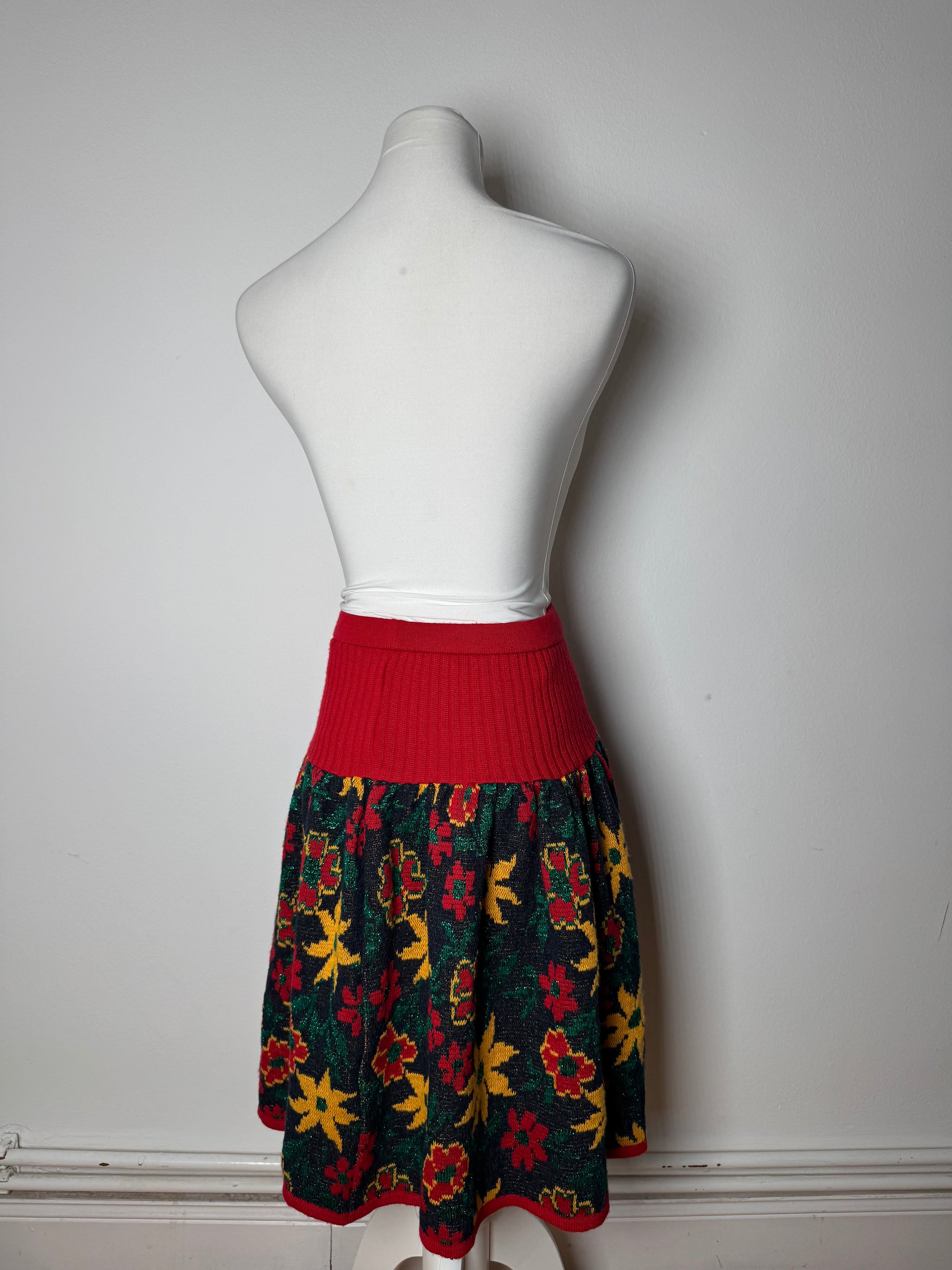 This vibrant vintage skirt features a red base colour with a multicolour floral pattern in green, yellow, and red. It is designed with an elastic waistband for a comfortable fit. The mannequin shown in the photos is size 38/M.